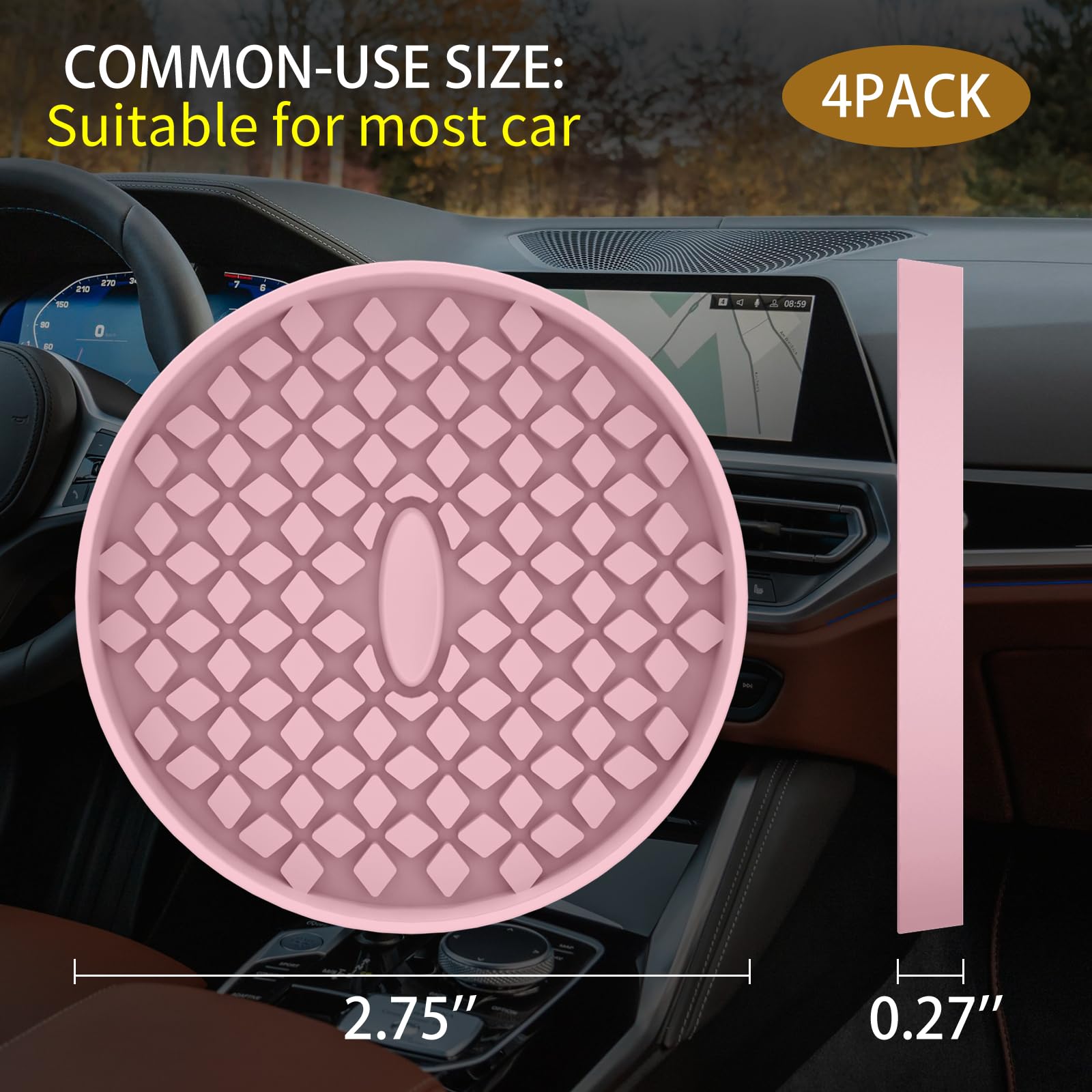FIT MOST CAR CUP HOLDER SIZE: The thickening car cup coaster's thickness is 0.27'', the deep hem design can hold more overflow of water, juice and liquor from the cup. Diameter: 2.75'', which is suitable for most car cup holder applications. [ Please measure your car's cup slot size before purchasing, to avoid the size error to bring you trouble. ]