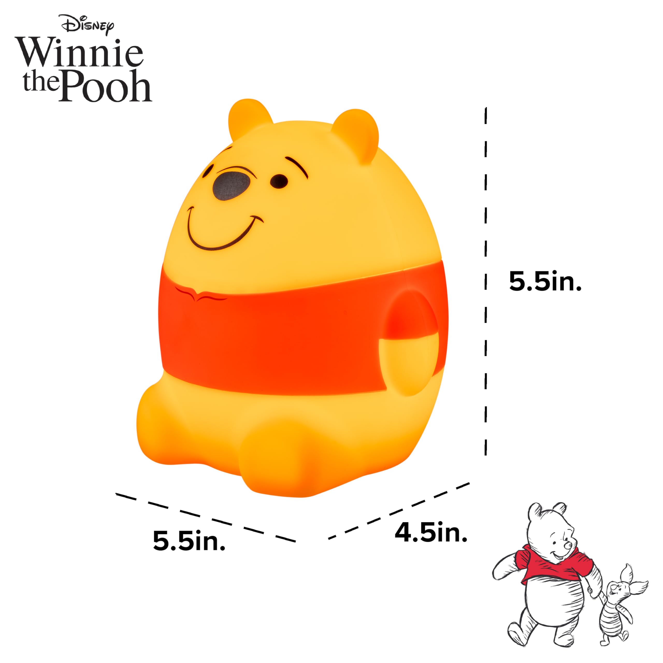 Make nighttime sweeter than honey with Disney’s Winnie the Pooh Squishy Light! Featuring the lovable, huggable Pooh Bear himself, this cute, squeezable light is perfect as nursery lighting, a child’s bedroom night light and much more. Fill any space with a soft, warm amber glow as Winnie the Pooh lights the night, naptime or anytime in between. Simply press the power button to turn the light on, then gently tap the light’s base to switch between three brightness levels. Press and hold the power button to turn the light off. There are two ways to power the squishy light — the included USB-C cable or three AAA batteries (not included). Using the USB-C cable (5V, 1A USB-A adapter required) provides a streamlined, energy-efficient way to illuminate your space. Using batteries lets you take Winnie the Pooh with you on the go and serves as a backup to keep the light on for 60 minutes if the power goes out. Created to last, cool to the touch and certified for safety, this light is designed for your peace of mind. Always have a friend nearby to light your way with the adorable charm of Disney’s Winnie the Pooh Squishy Light.