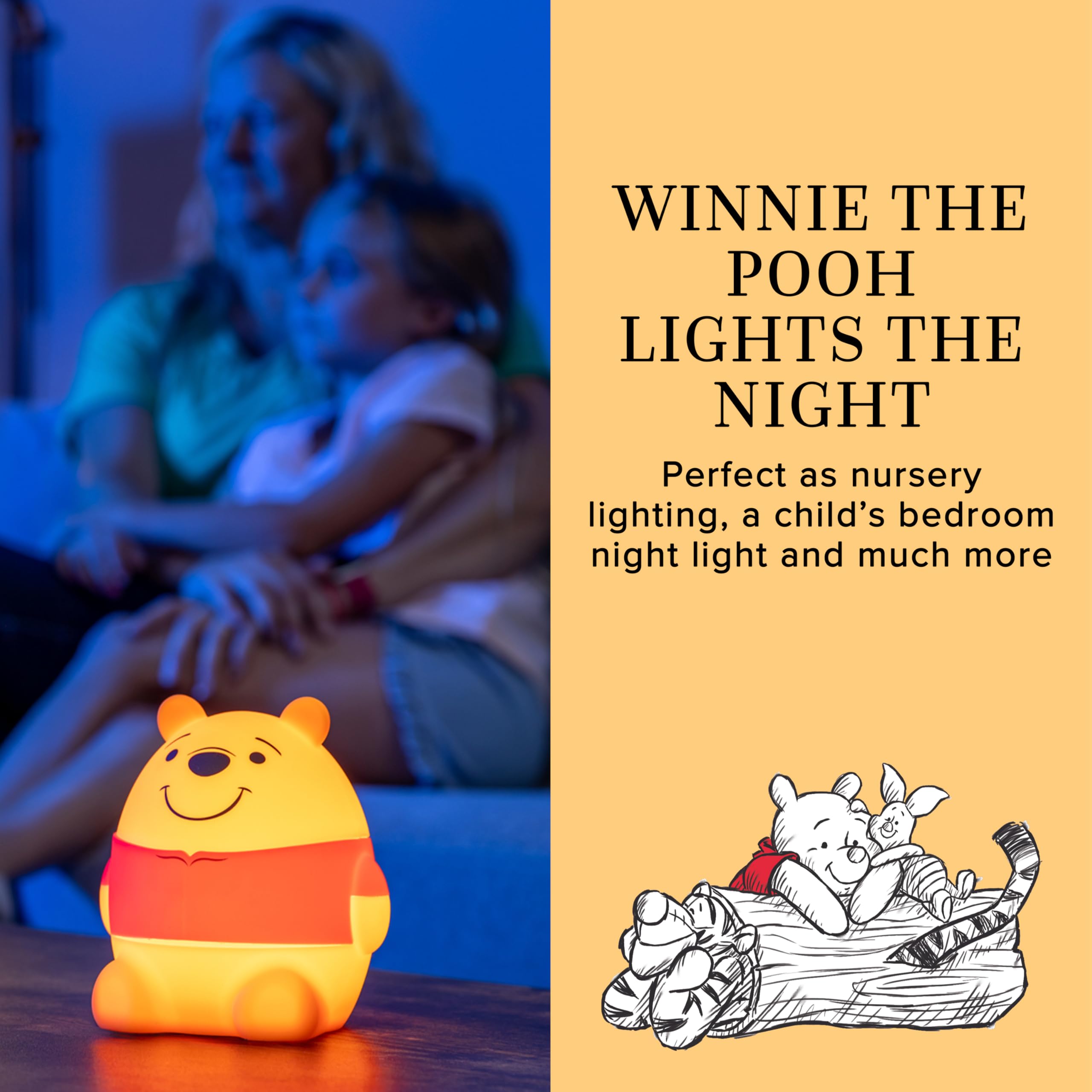 Winnie the Pooh lights the night – Soft, squeezable light features the lovable, huggable Pooh Bear — perfect as nursery lighting, a child’s bedroom night light and much more