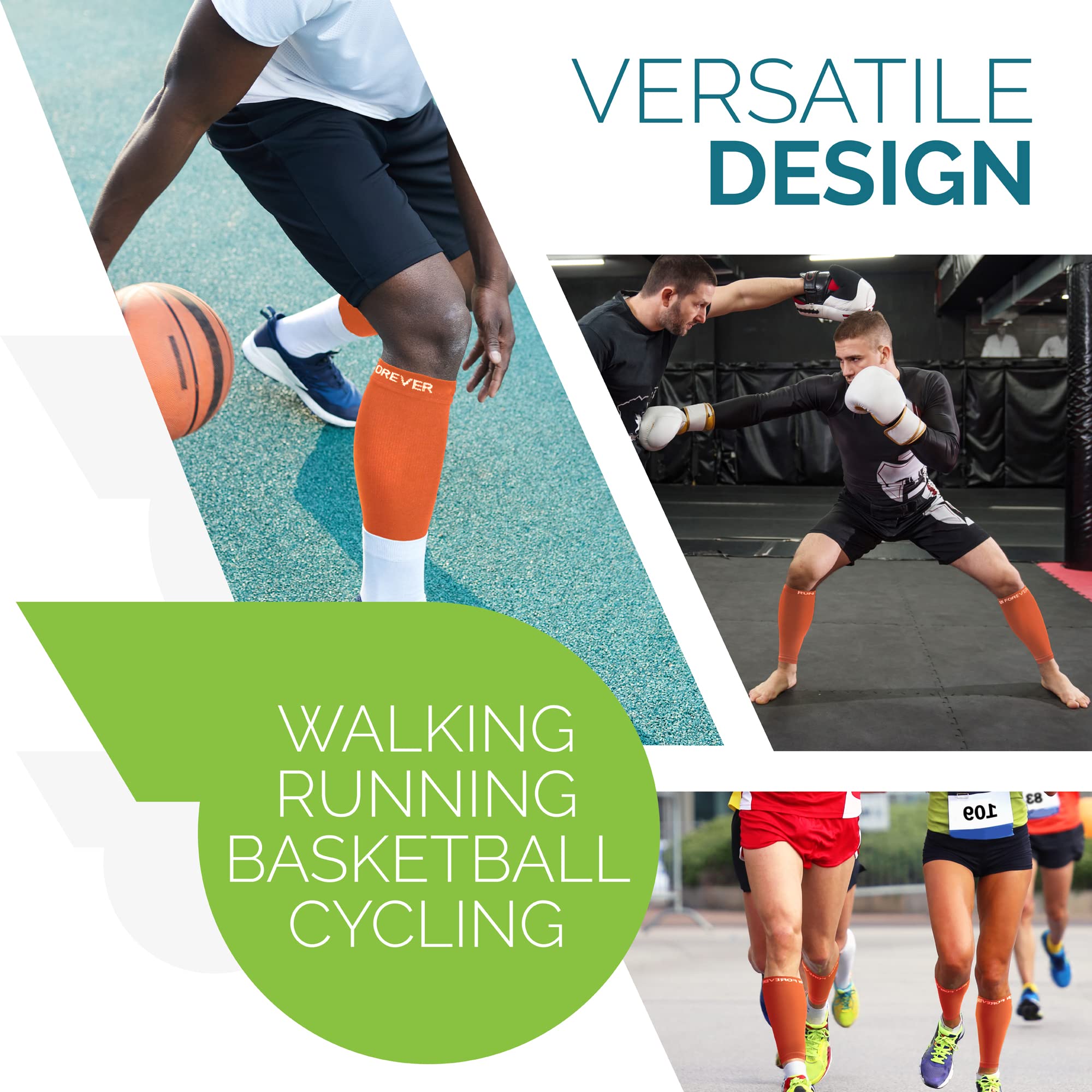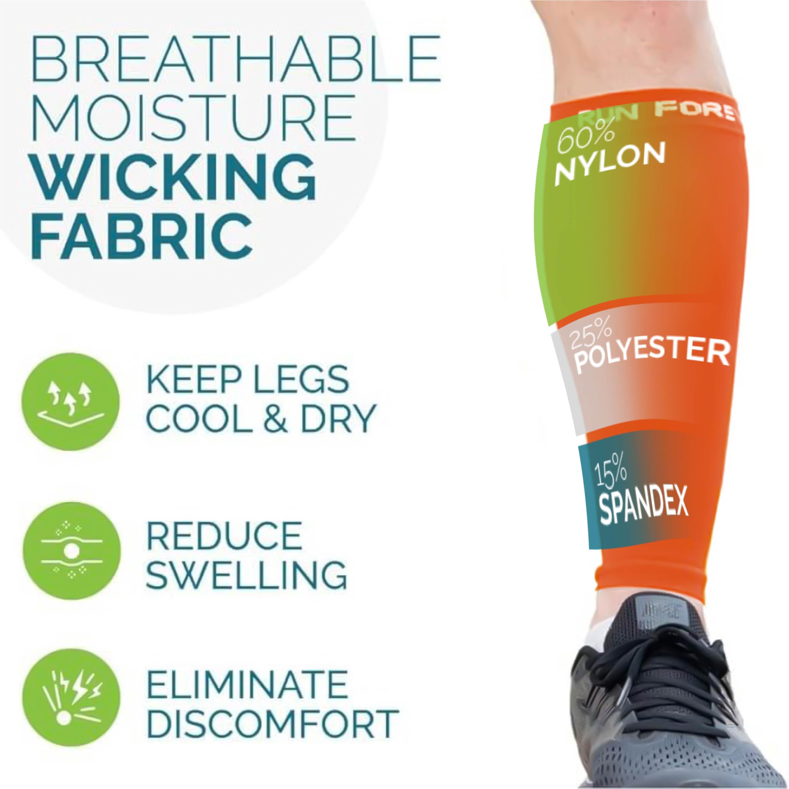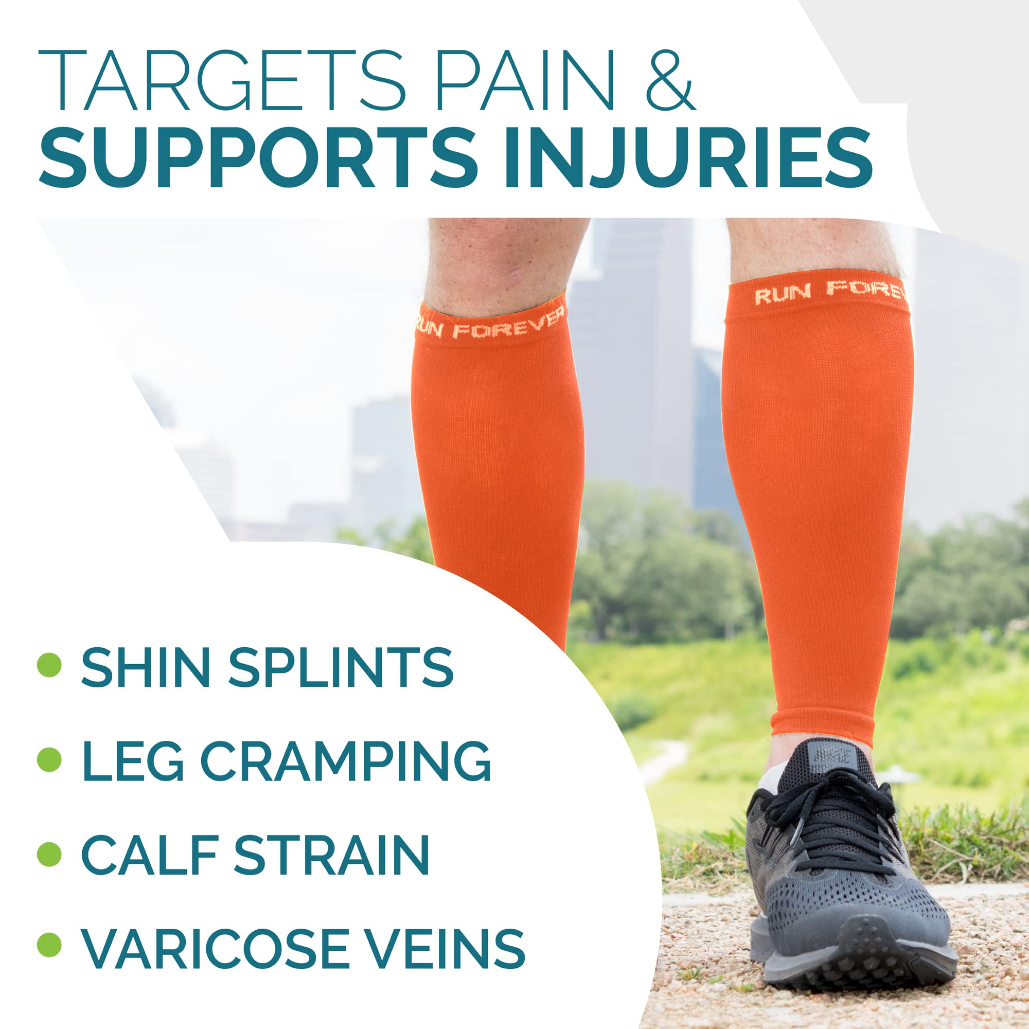 Multiple designs, colors & sizes: Run Forever Sports calf compression sleeve for men & women has many engaging colors and caters to all sizes, from small, to xl, to plus size!