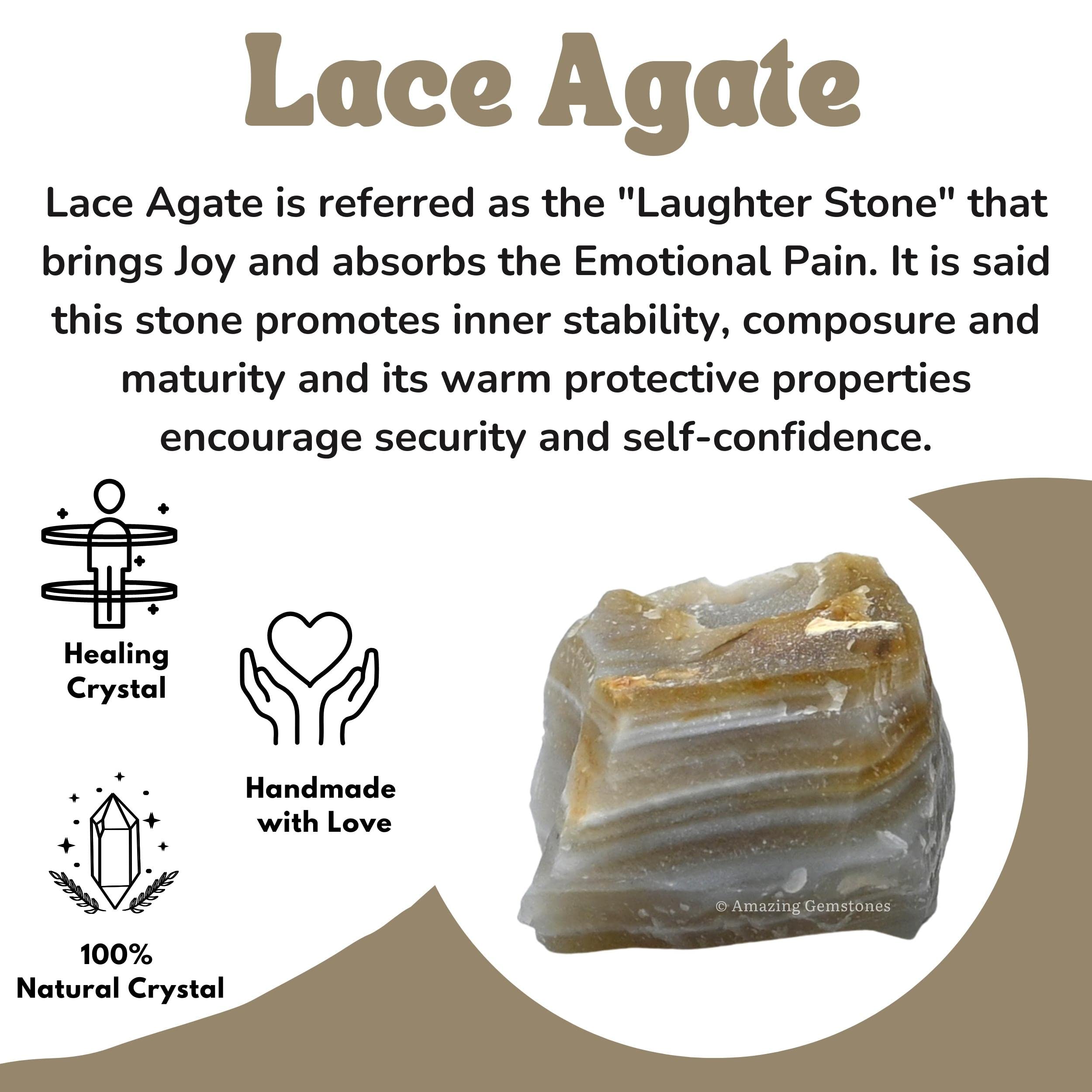 Natural - You will receive authentic raw stones crystals, lace agate is referred as the "Laughter Stone" that brings Joy and absorbs the Emotional Pain. It is said this stone promotes inner stability, composure and maturity.