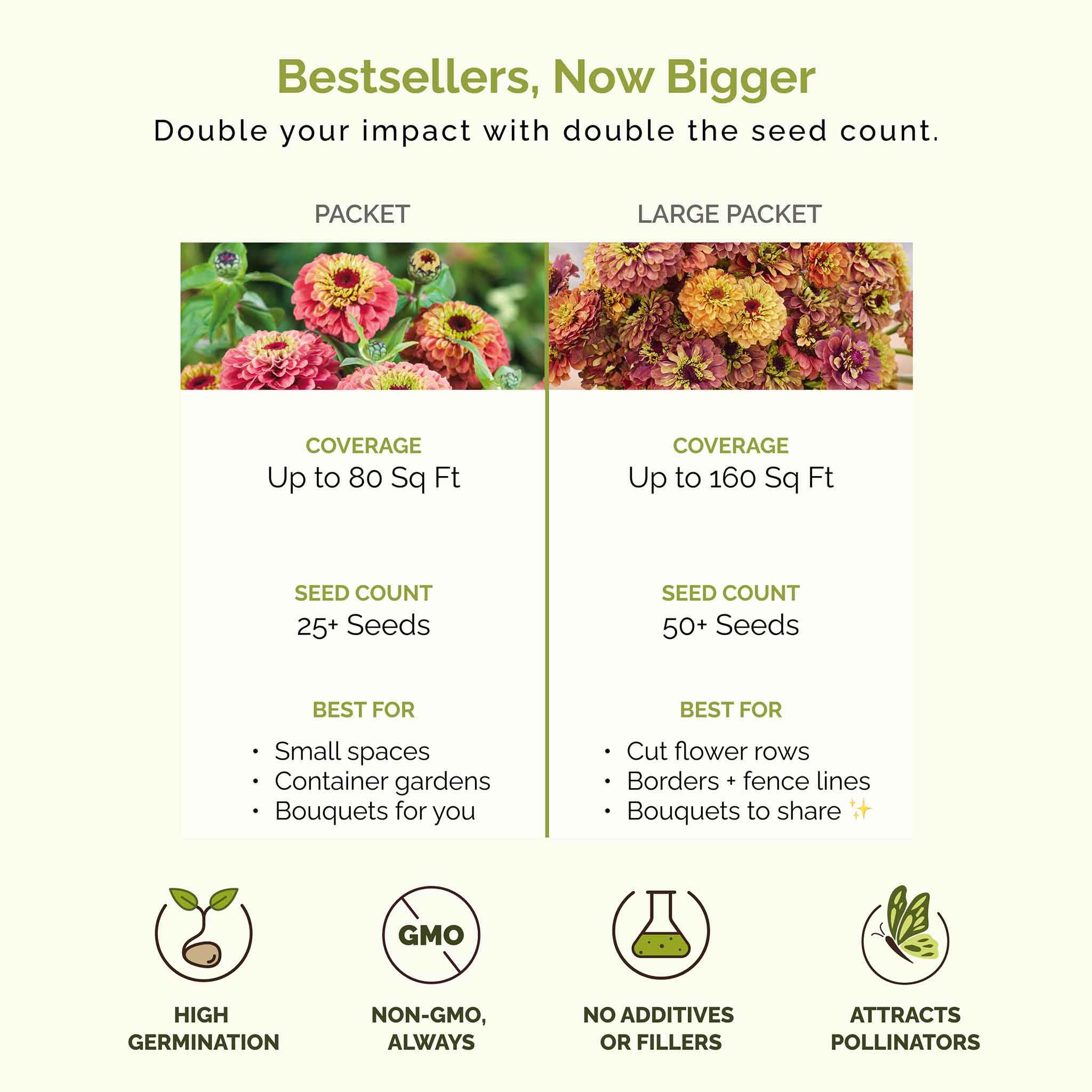 100% Pure, Non-GMO Seeds – No fillers, just the real deal! This variety of Zinnia should be planted 1/4" deep and 6" apart during spring with expected germination in 7-10 days.