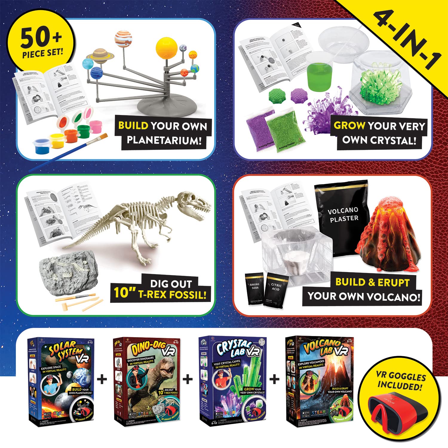 IMMERSIVE LEARNING EXPERIENCE! Dig out a T-Rex fossil, erupt a volcano, build your own solar system, and grow your own crystals!