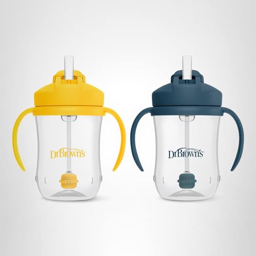 Tip and sip in any direction! Dr. Brown's Baby's First Straw Cup simplifies the bottle-to-cup transition for you and baby. Designed with a soft, weighted straw, baby can drink from any angle – helping them transition from tipping the cup upside-down to sipping upright. Baby's First Straw Cup features handles that lock in place to make it easy for little hands to hold. The cup is contoured, and the handles are removable, so it grows with baby as their cup-holding skills improve. The travel-friendly lid slides open for baby to drink and slides closed to keep the straw clean when not in use – plus it's spill-proof! Comes in lots of fun colors and themes you and baby will love. All parts are removable for easy cleaning. Dishwasher (top rack) and sterilizer safe. Do not put in microwave. Straw cleaning brush included. 9 oz/270 mL. BPA-free. 6m+.