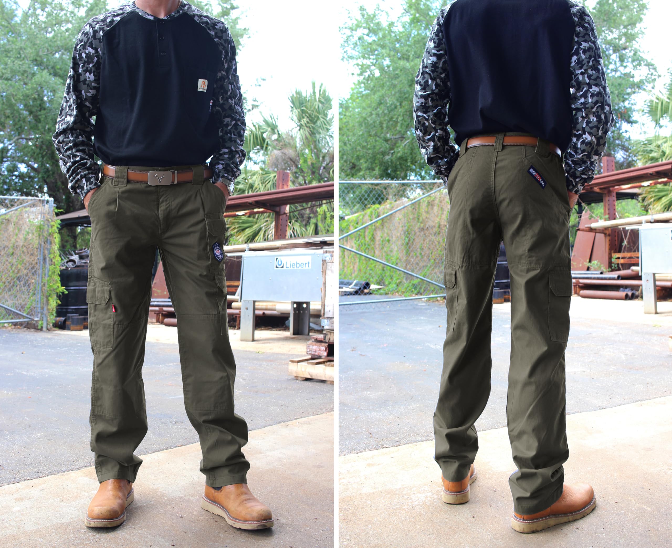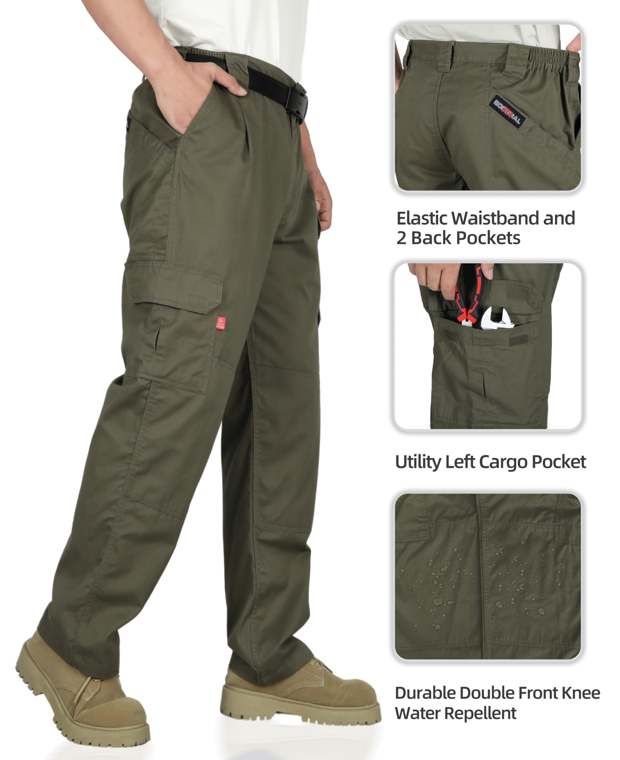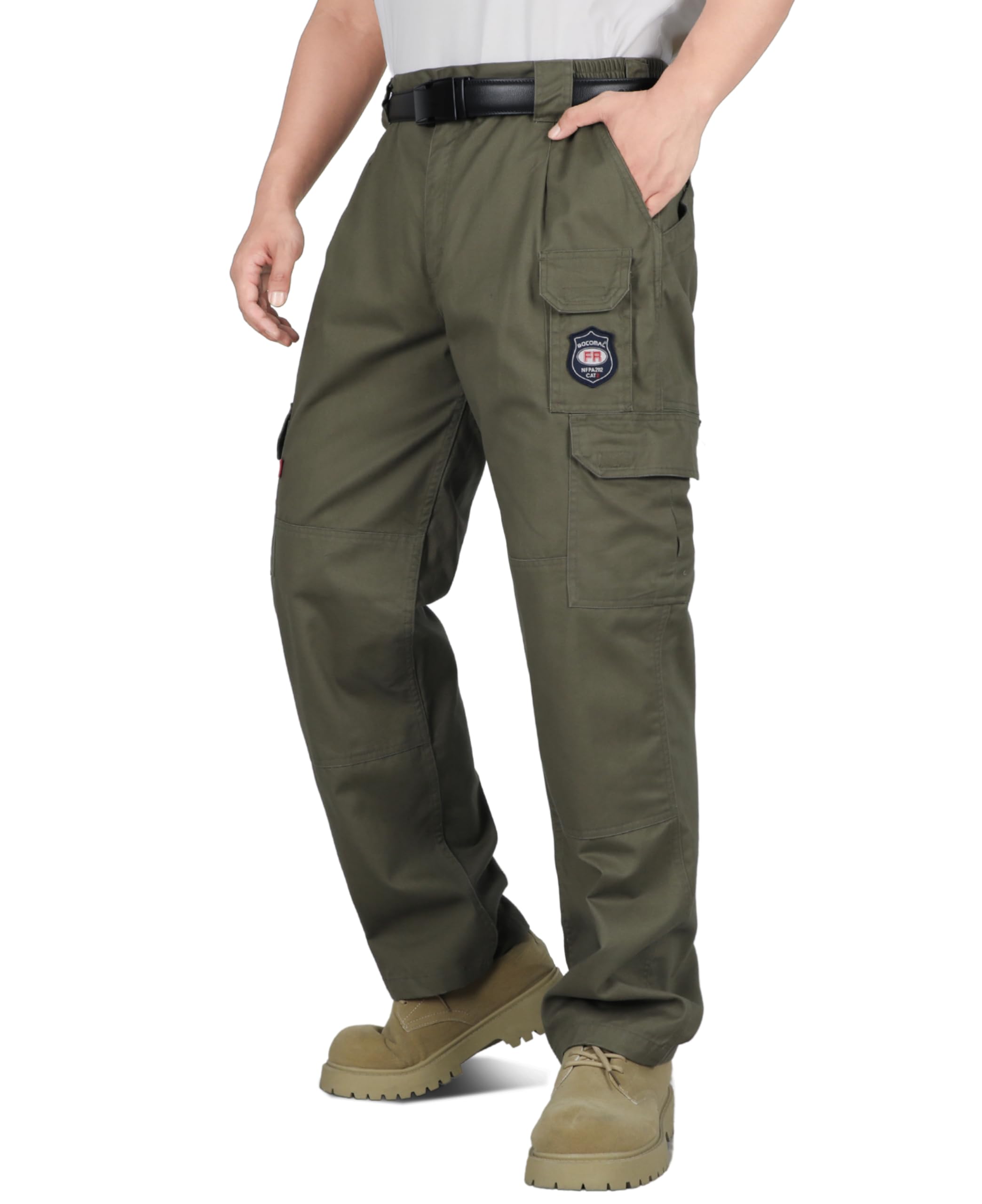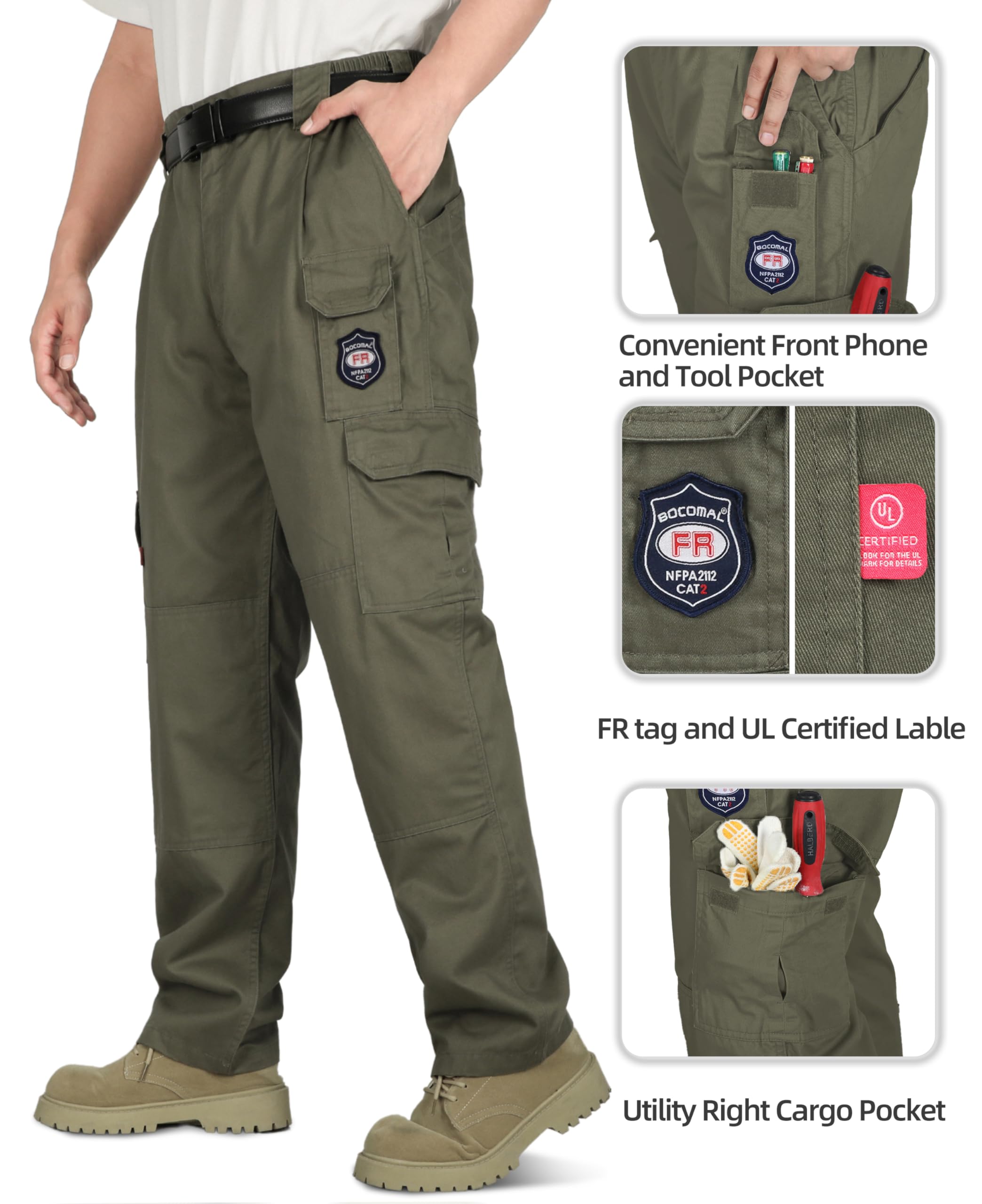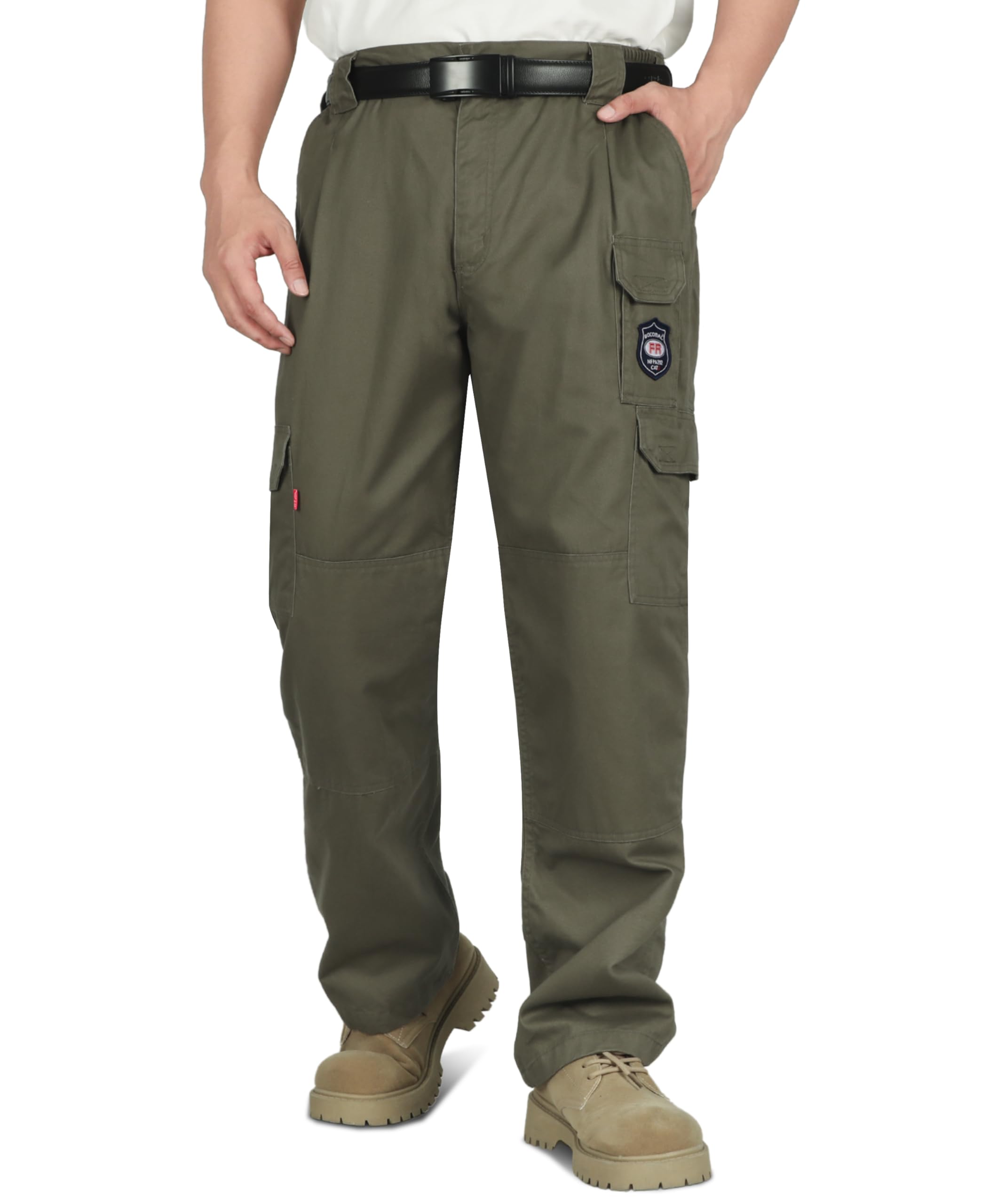 FASION AND COMFIT:This FR work Pant has 7 Pockets and elstic waist band, provides a Perfect and comfortable relaxed Fit.Also soft and fashionable.We did prewash/ preshrunk and wrinkle-free.Machine wash No shrink! Double needle stitching on outseam. Left and right cargo pockets at the thighs with flaps to keep items secure.