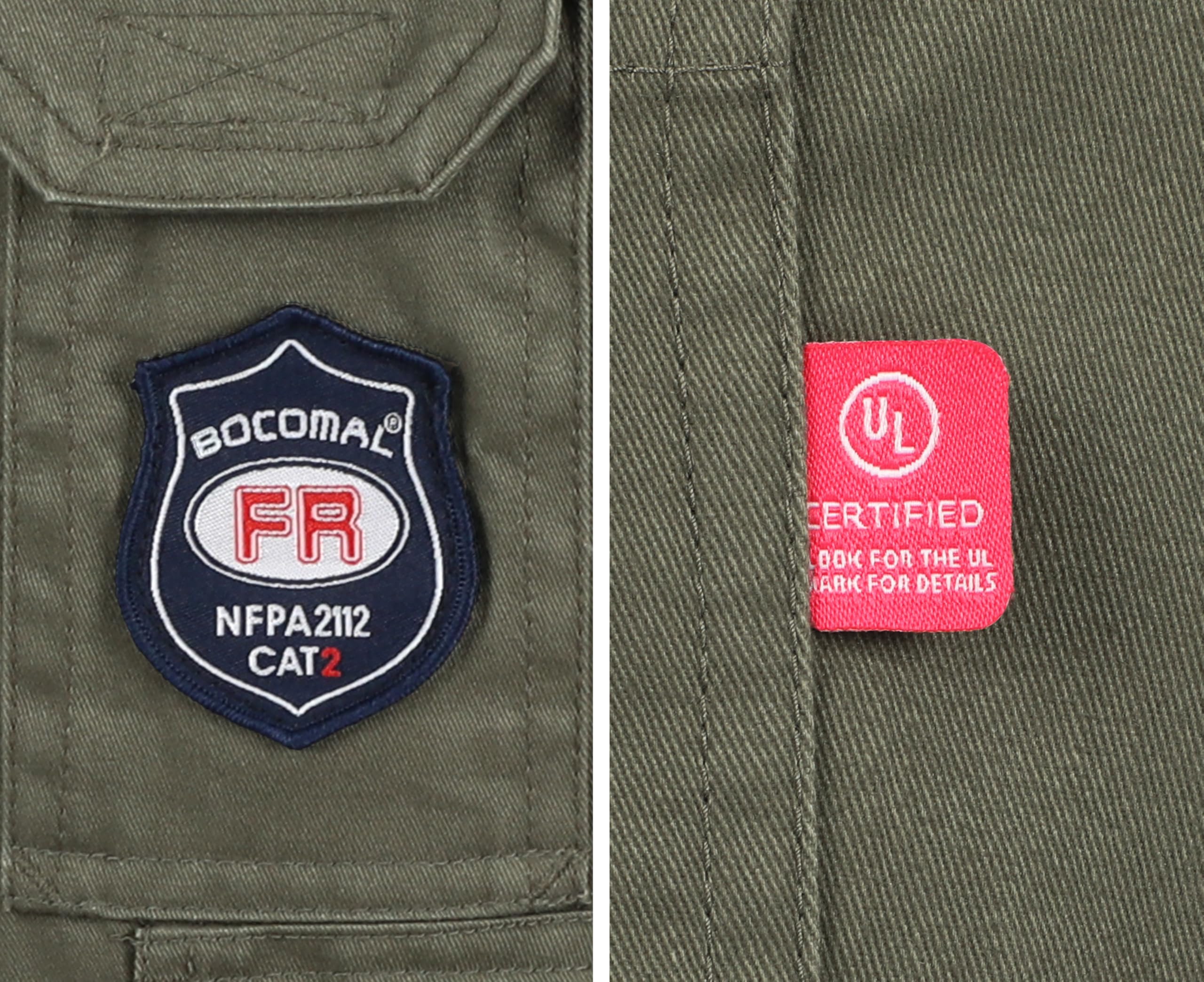 FR MATRIALS:Light Water/Rain Repellent and Oil/Stain Resistant,7.5OZ Cotton Twill FR Treated,FR Buttons,FR Aramid Sewing Threads!Clear FR Tag on Phone Pocket front.More FR info On Neck Tag about UL Certification.We Attached A Small Sample Inside Package for Customers Simple FR Try