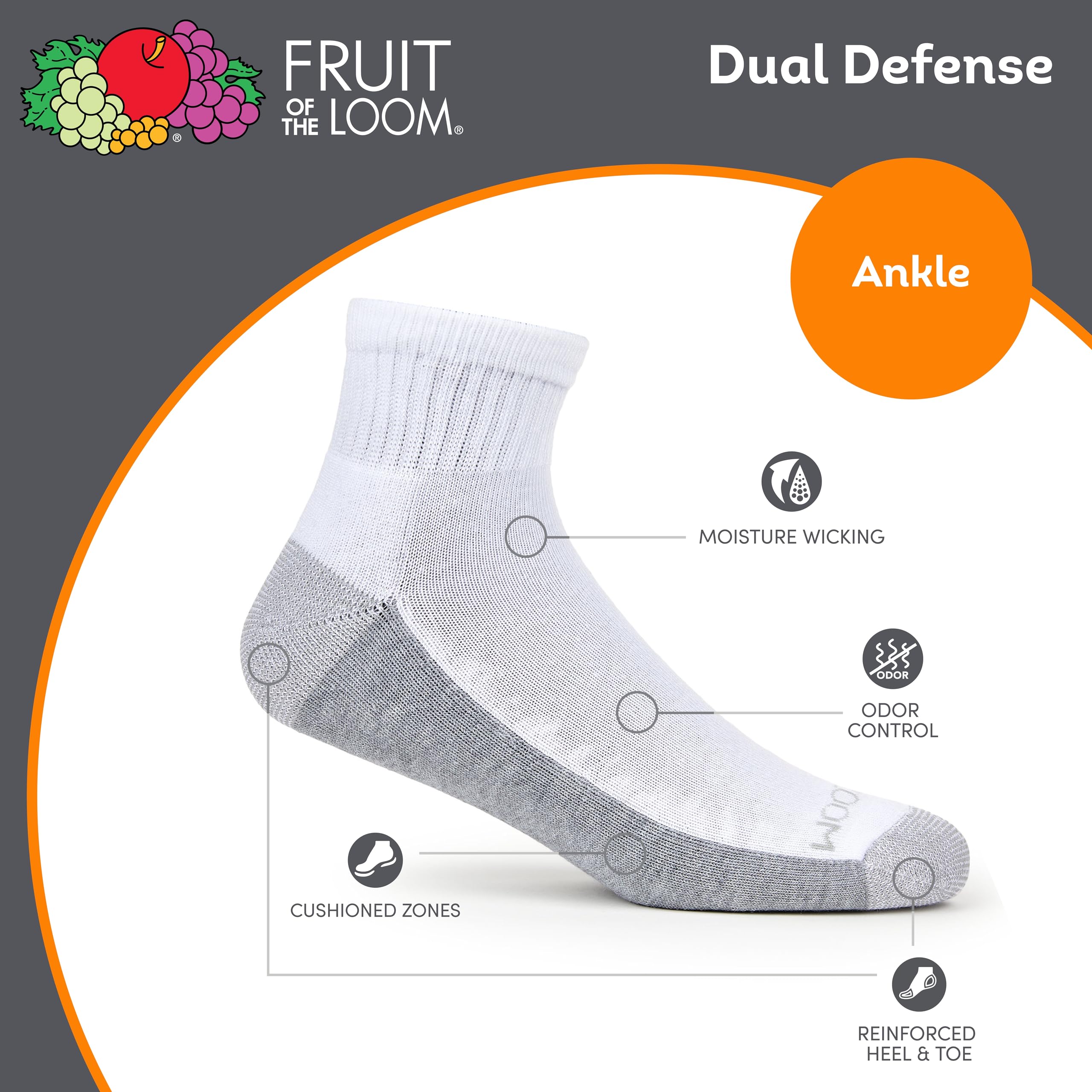 Description Our men's ankle socks in a 12-Pair value pack feature dual defense technology's long lasting moisture wicking and odor protection. Cushioned for comfort, these everyday socks also have a reinforced heel and toe for added durability.