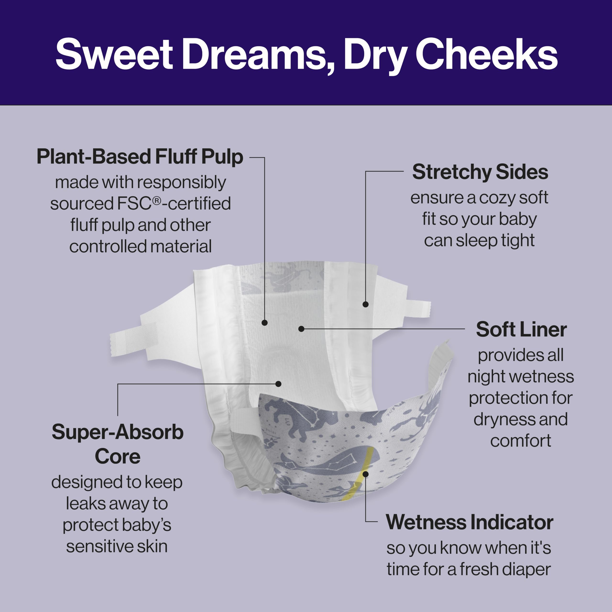 DESIGNED FOR DELICATE SKIN: Hypoallergenic, dermatologist tested, fragrance free overnight diapers designed with a soft inner liner to draw wetness away for comfort