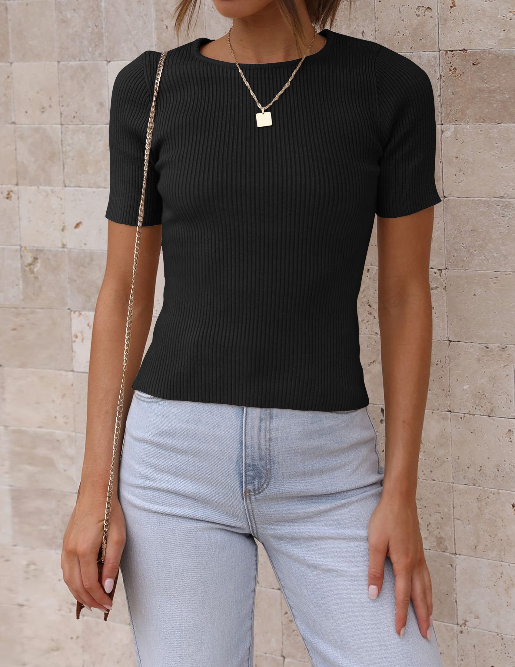 Update your chic edit with our knit tops. This summer tops for women feature a classic round neck, short sleeves, ribbed knit texture, slim fit, solid color, casual and simple style
