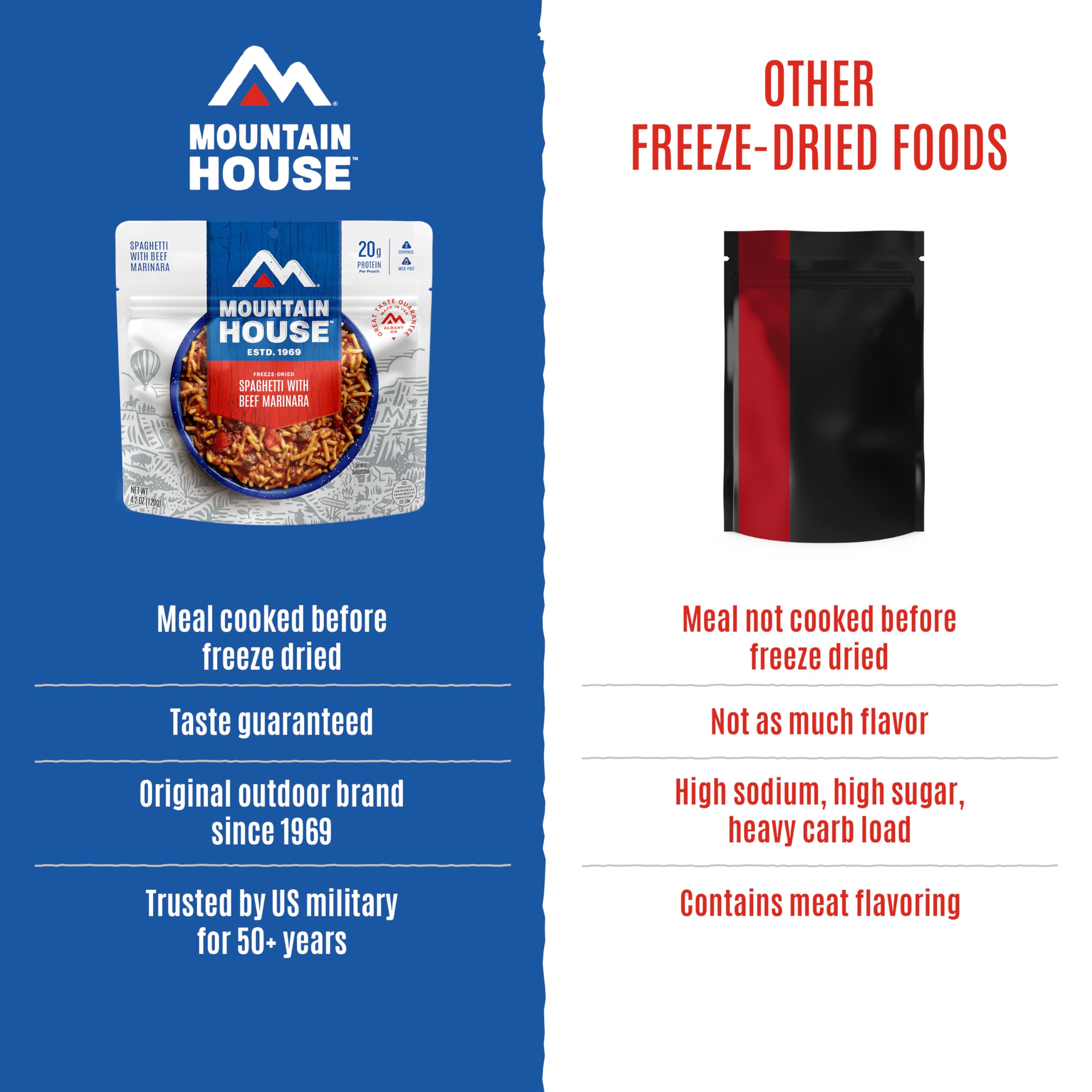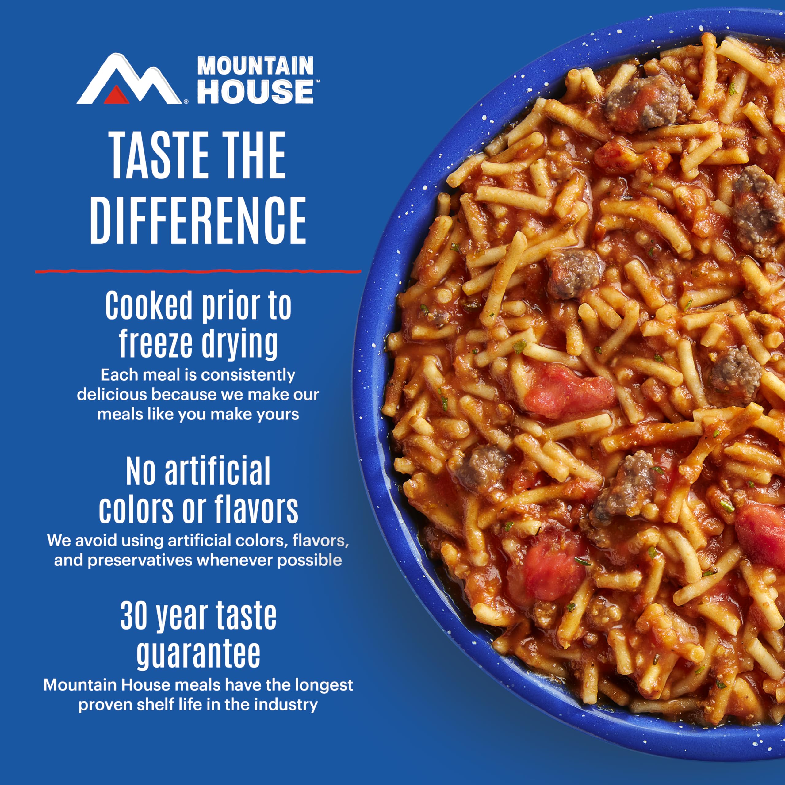 Since 1969, Mountain House has been the trusted leader in freeze-dried meals for camping, backpacking, hiking, and emergency food storage. Known as the original and best-tasting brand, Mountain House makes comfort food that feels like home—even when you’re miles away on the trail. Every pouch is lightweight, portable, and easy to prepare—just add water and enjoy a hearty, ready-to-eat meal in minutes. Perfect for outdoor enthusiasts, thru-hikers, campers, and families, our meals won’t weigh you down and make fueling your adventure simple and satisfying. Unlike other survival food and emergency rations, Mountain House focuses on taste first, delivering classic recipes and comfort food flavors that keep you energized and happy wherever you are. Backed by our Taste Guarantee and a shelf life of up to 30 years, Mountain House is also the go-to choice for preppers and long-term emergency food supply storage, giving you peace of mind that your pantry is always stocked for the unexpected. Whether you’re conquering a summit, planning a weekend camping trip, or building a reliable survival kit, Mountain House ensures you’re ready for every adventure—because with us, it’s always adventure made delicious.