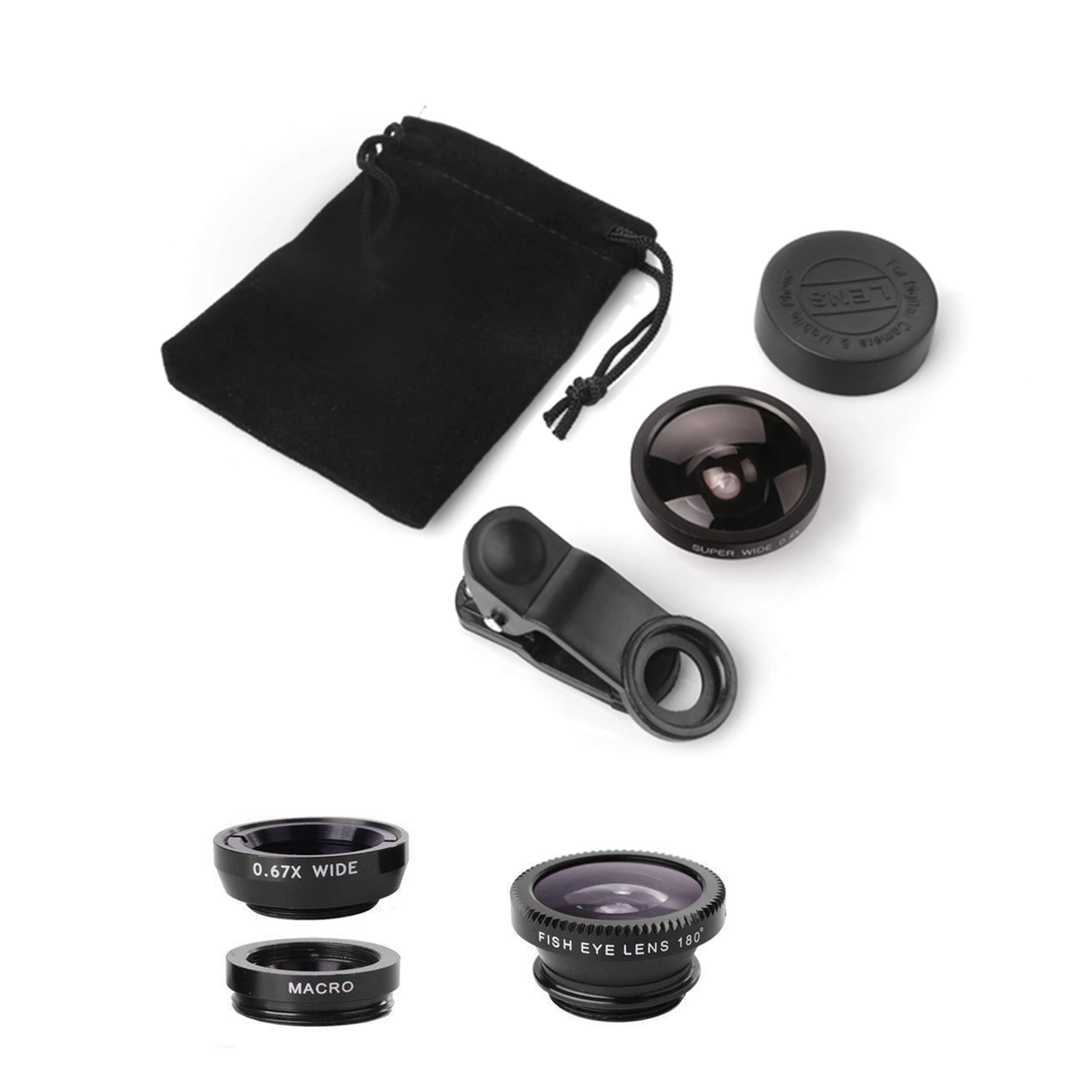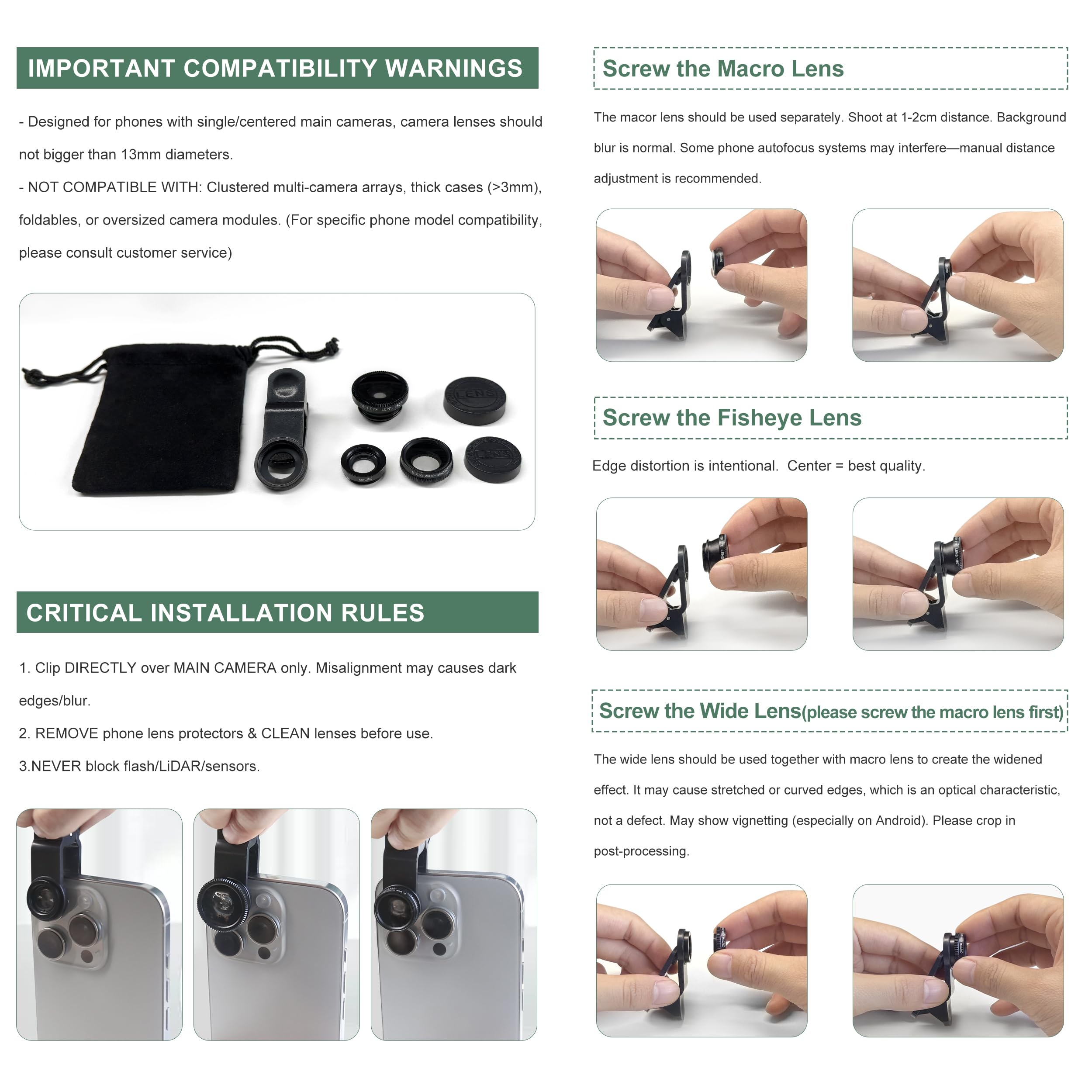 Package Content: 180 Degree Fish Eye Lens+0.65X Wide Angle+10X Macro Lens. Note: 1. The Macro Lens and the Wide Angle Lens are attached together upon receival! The wide lens should be used together with macro lens. 2. The macro lens can be used seperately, suggest keeping 1-2cm distance from your object to take more clear pictures. Some phone autofocus systems may interfere—manual distance adjustment is recommended. May show vignetting (especially on Android). Please crop in post-processing.