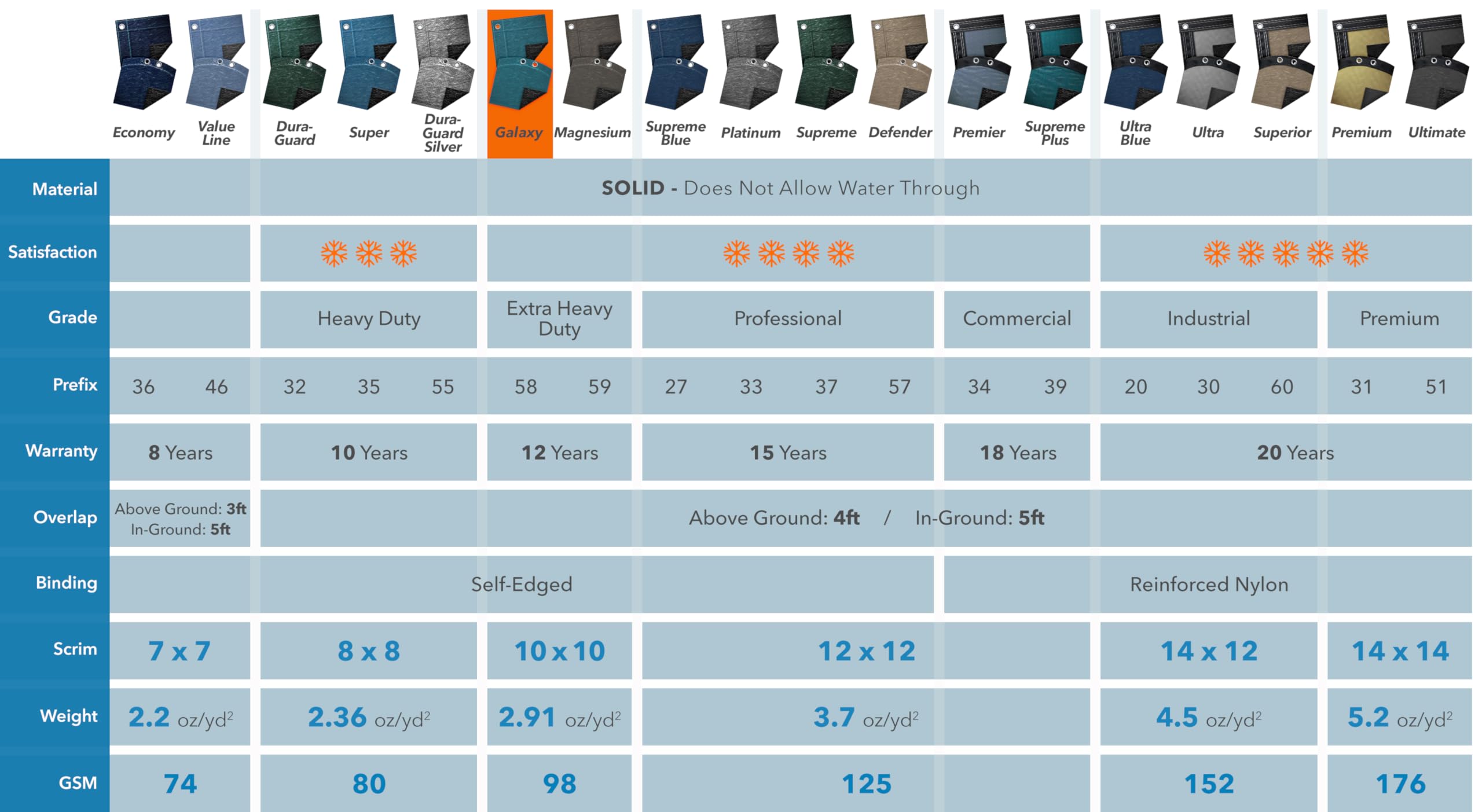 This Extra Heavy Duty pool cover is constructed with extra heavy duty polyethylene that weighs 2.91 ounces per square yard (98 grams per square meter). The material is woven with a 10 x 10 scrim. Scrim is the number of threads per square inch. Material weight and scrim are the best indicators of the overall durability and expected longevity of your pool cover.