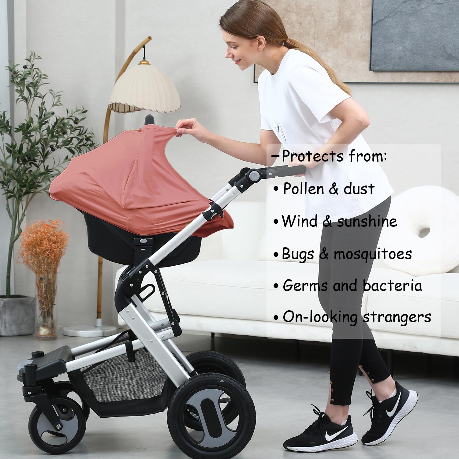 BREATHABLE & STRETCHY FABRIC: Our car seat cover made of buttery soft, breathable and stretchy premium quality fabric that is specially designed to provide maximum airflow (top have a open hole). It's doesn't need any zippers / snaps to fixed on the carseat, it's very easy to use. 27.45 * 25.39 inches size provides full coverage and enough space while nursing. Create a cooling, soft and quite environment for your baby.