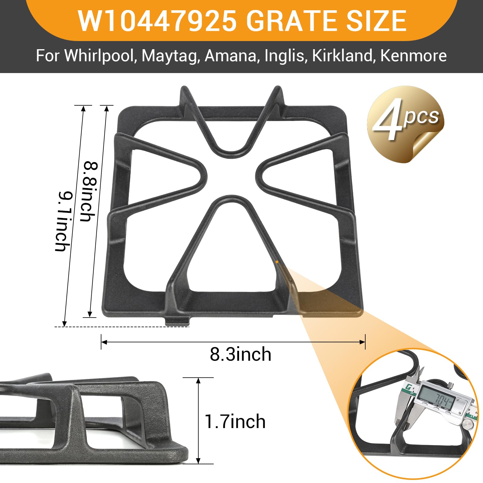 Perfect Dimensions:W10447925 Gas Stove Burner each piece dimensions:8.3" L × 8.8"W × 1 5/8"H;Stove accessories in a 4-piece pack, providing stable flat support and compatible with various Whirlpool/Maytag/Kenmore and other surface cooktop models.For more models, please visit the details page and press 'CTRL' + 'F' to locate your model number for comparison with our listing