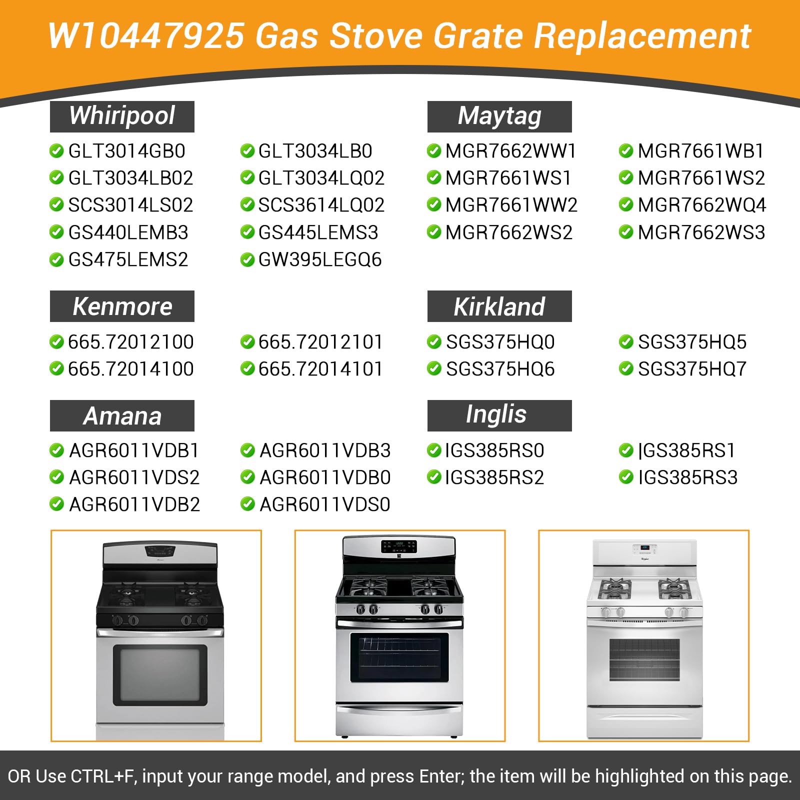 Compatible With Whirlpool Gas Stove Burner Parts:Fits Whirlpool Stove Parts stove burner covers, and Kenmore Maytag Gas Range Part Amana Inglis Kirkland Cooktop Stove Accessories.W10447925 Gas Stove Burner replaces W10447925,W10166295,W10165803,W10333861A,8522858,8522851,8053455,WP8522858,WPW10166295,WPW10165803,WP8522851,8522850,8053904,8053895,WP8053455,3196189,3195900,8053390,W10333861,W10335352A,W10335352 and other models replacements in the same series cast iron stove grates.