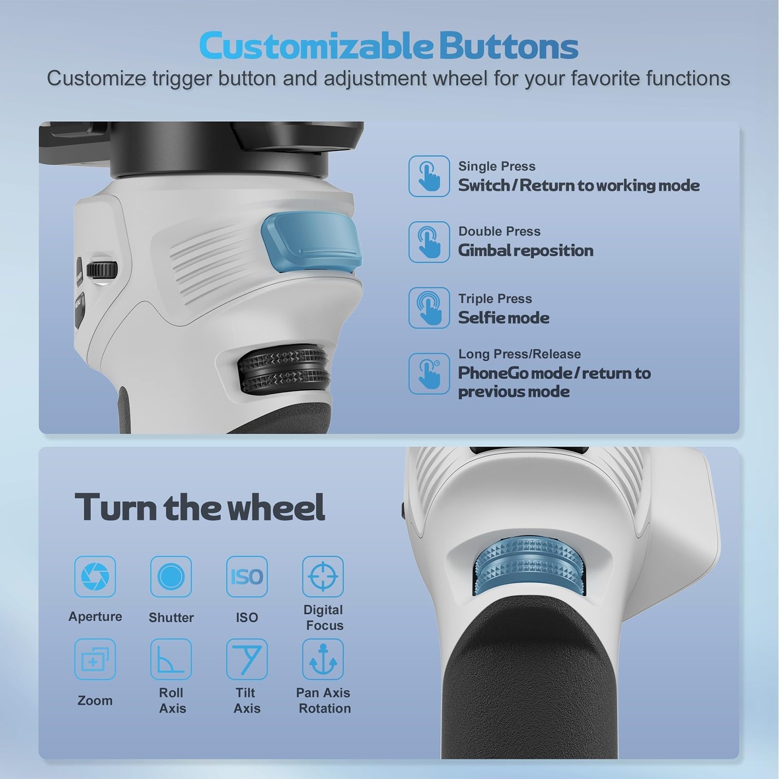 【Bluetooth Shutter Control】Weebill 3E supports wireless bluetooth adaptation and control. The recording button can control the camera to start and stop recording or trigger the photo function, fully reducing wire constraints. The camera automatically pairs after being connected for the first time, saving time and effort when shooting.