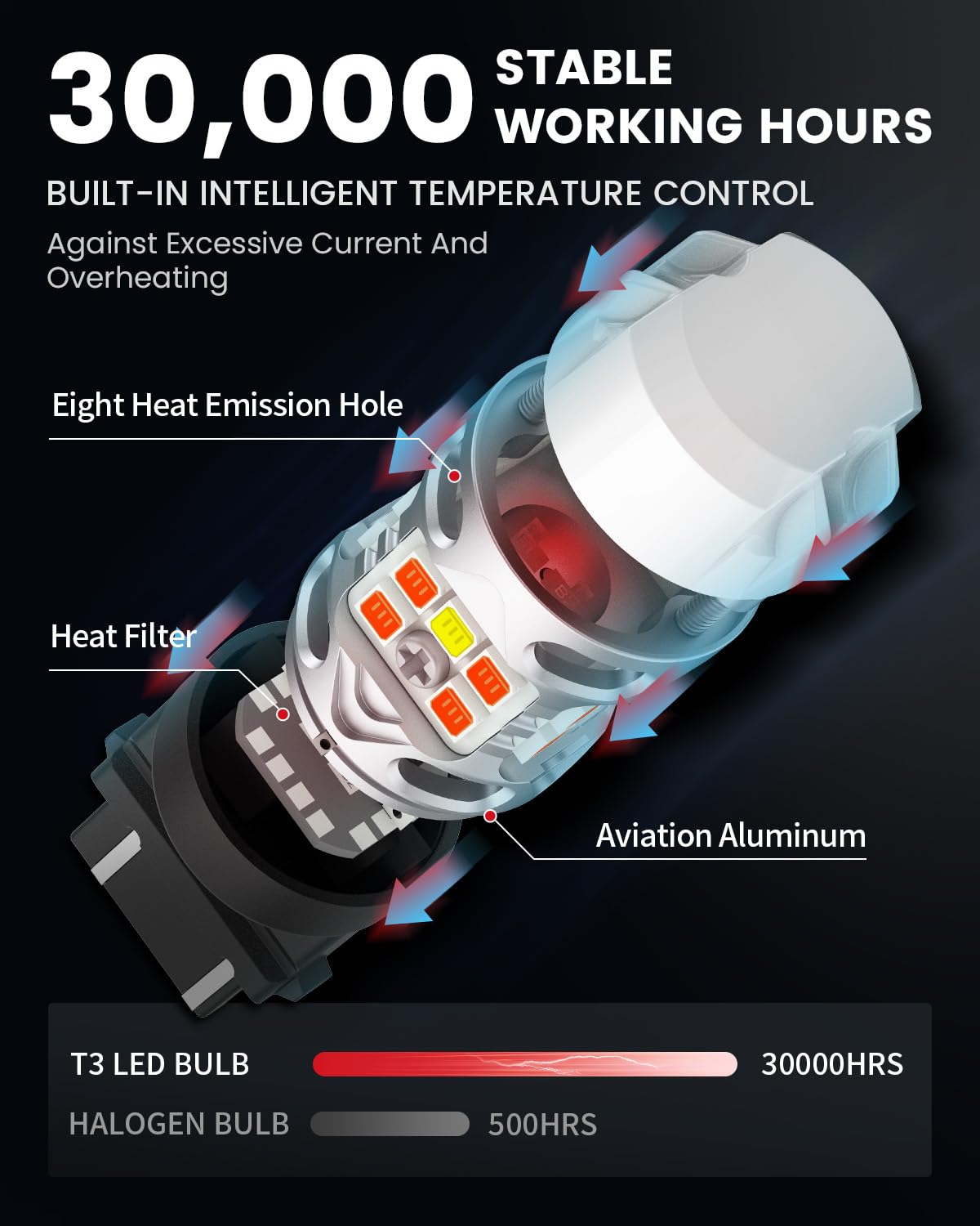 500% Brighter,Dual Color: The LASFIT T3 3157 Switchback LED bulbs are 500% brighter than halogen bulb. They feature 20 high-quality 3030 LED chips,delivering comprehensive 360°illumination.Each bulb provides 4000 lumens and 48 watts of amber light for turn signals, and a cool white light for daytime running lights and parking lights.The brightness is accurately measured,ensuring reliable performance.Experience enhanced style and vibrant colors while driving with these superior bulbs.