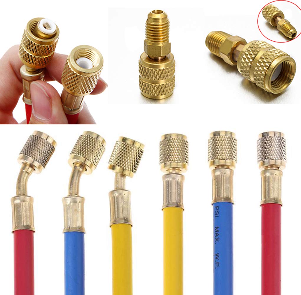 Refrigerant charging hose with Diagnostic Manifold Gauge Set deigned to meet 1/4" SAE requirement for refrigerant permutation, fit most refrigerants like R410A, R22,R404.Standard 1/4 inch female flare fittings with a valve core depressor and 45°bend on one end for convenient access to the system