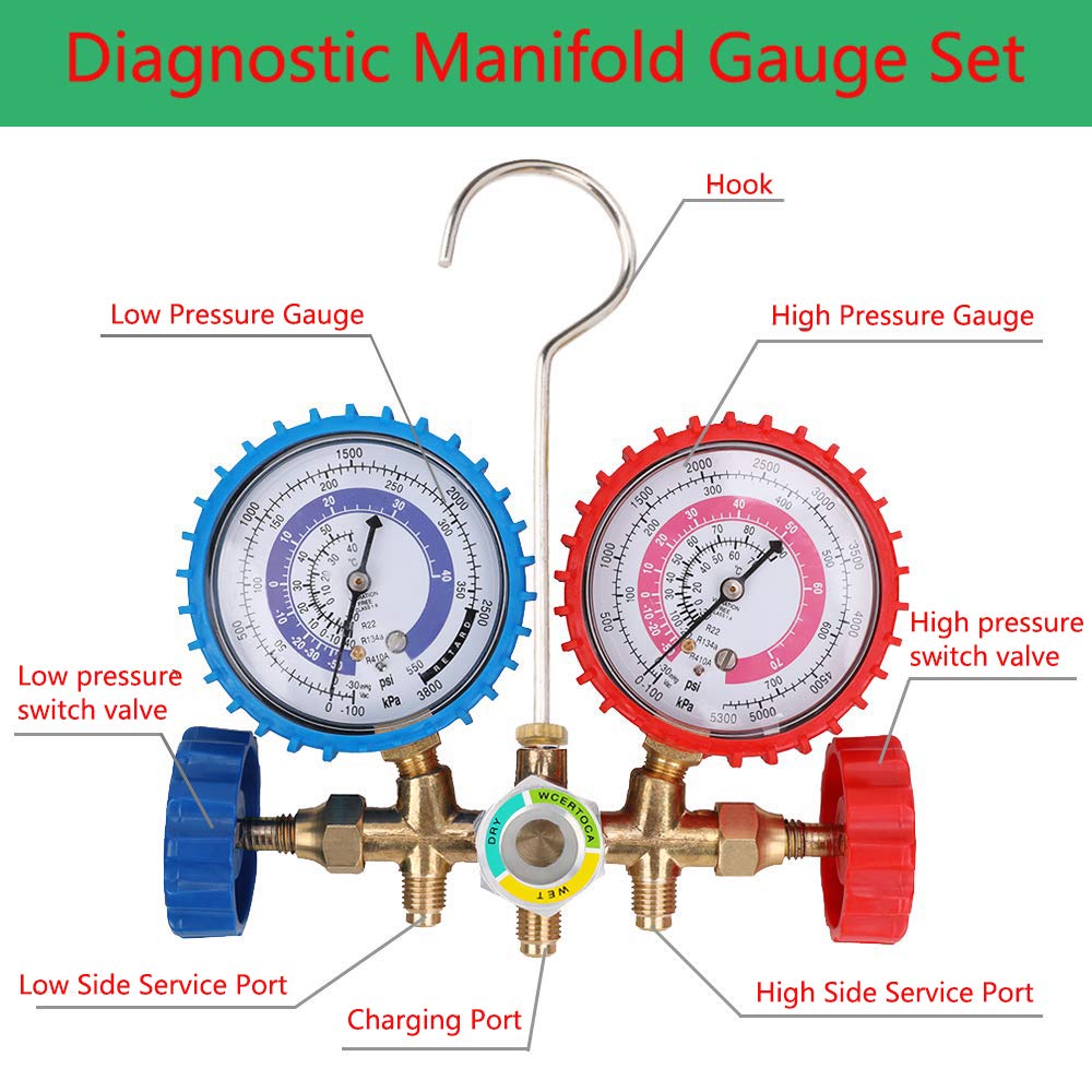 Brand New and High Quality ,Solid Brass connections Applicable Refrigerant: R410A, R22,R404 Thread Size: 1/4 inch,Overall Length: 1.5m / 60 inch Refrigerant Charging Hoses: 800 PSI working pressure and 4000 PSI burst pressure Professional 3-way air conditioning diagnostic manifold gauge set for R410A R22 and R404 refrigerants. Designed for AC charging, diagnostic check and recovery work. Gauges can be easily recalibrated in the field to maintain accuracy Heavy duty hook for hanging the manifold gauge in place,Extra-large sight glass; Quick disconnect couplers for high/low fittings included 45 Degrees angle on the service port site for easier access Package Content: 1x Set of Manifold Dual Gauges 3x Color Coded Charging Hoses 2x 5/16" SAE Adapters for R410a