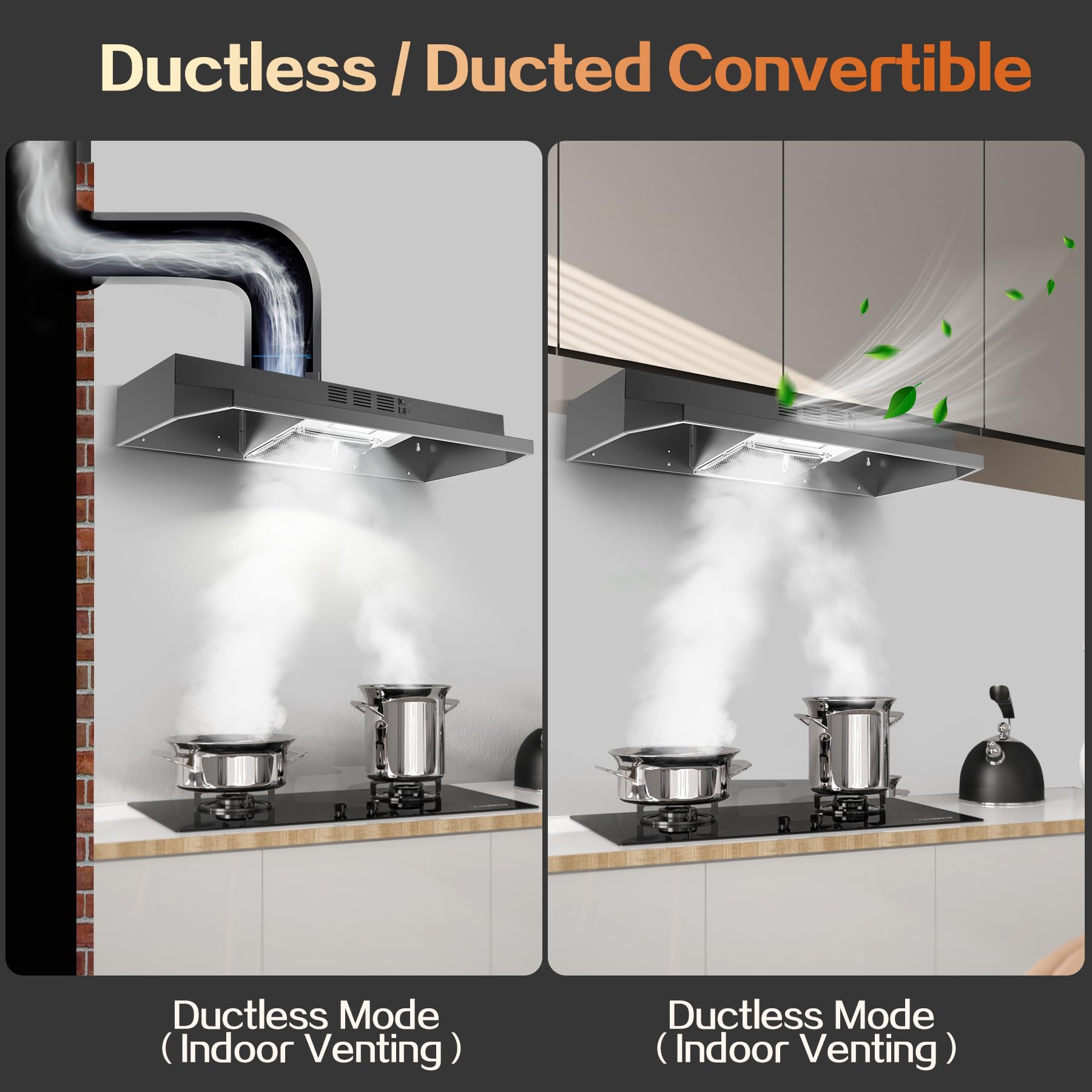 Ducted/Ductless Convertible: 36 inch vent hood features a top 7-inch ducted vent and a rectangular rear vent, which it is perfect to keep the kitchen and cooking space smokeless and odor free. With 1 premium quality filter: aluminum mesh & activated carbon cotton composite filter , this ductless range hood specifically designed for room no extractor duct.