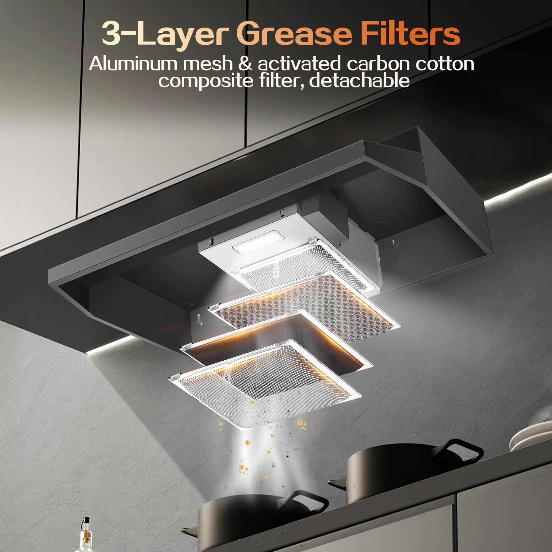 3-layer Grease Filter: Including one piece aluminum mesh & activated carbon cotton composite filter, this black range hood will purify the air, removing grease from the smoke. (Suggest replacing every 3~4 months, Part#ZMS-3976-F)