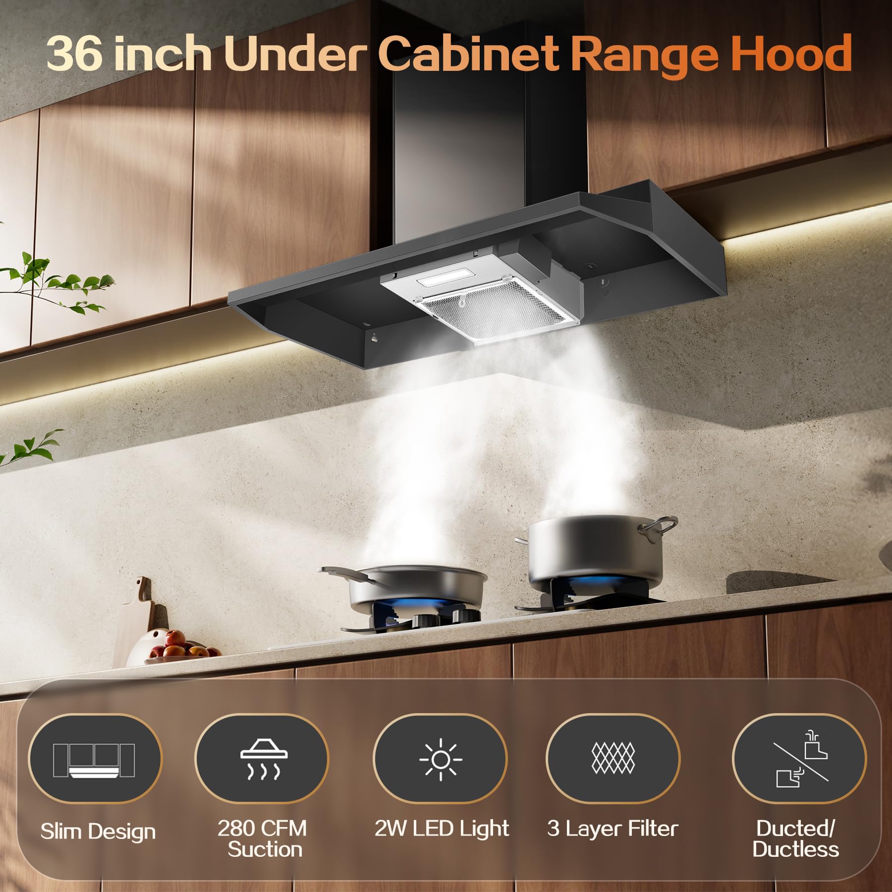 Bright and Effective Lighting: The kitchen hood 36 inch has one piece 2W LED light, not only brightness to meet your cooking need, but also the range hood save energy in your kitchen while emitting enough lights.