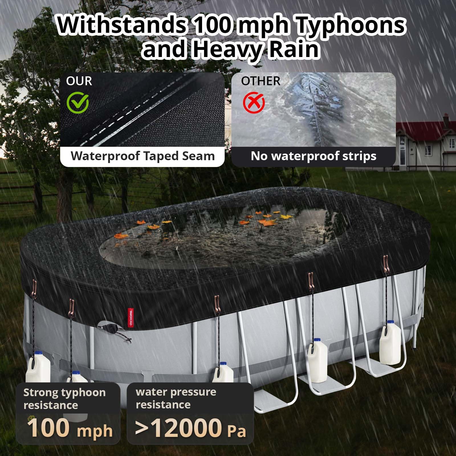 【Upgraded Tear Resistant Design】The edges of our oval pool cover are designed with a lay-flat seamless design (no risk of edge cracking compared to traditional double stitching). Upgraded 500D Oxford fabric has a tear strength of 330 lbs (lab test), which increases the durability by 3 times, far more than 420D/210D fabrics, ensuring the pool cover is stable for long-term use.