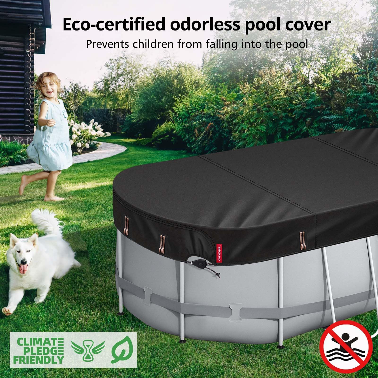 【Safer & Eco-Friendly Material】Our pool cover is Amazon Friendly Climate Certified and made of odourless, eco-friendly PU clear material that is safe for children and pets in hot environments, won't melt or leave a black residue, and is safer and more environmentally friendly than traditional PVC. Let you and your family enjoy the whole summer.
