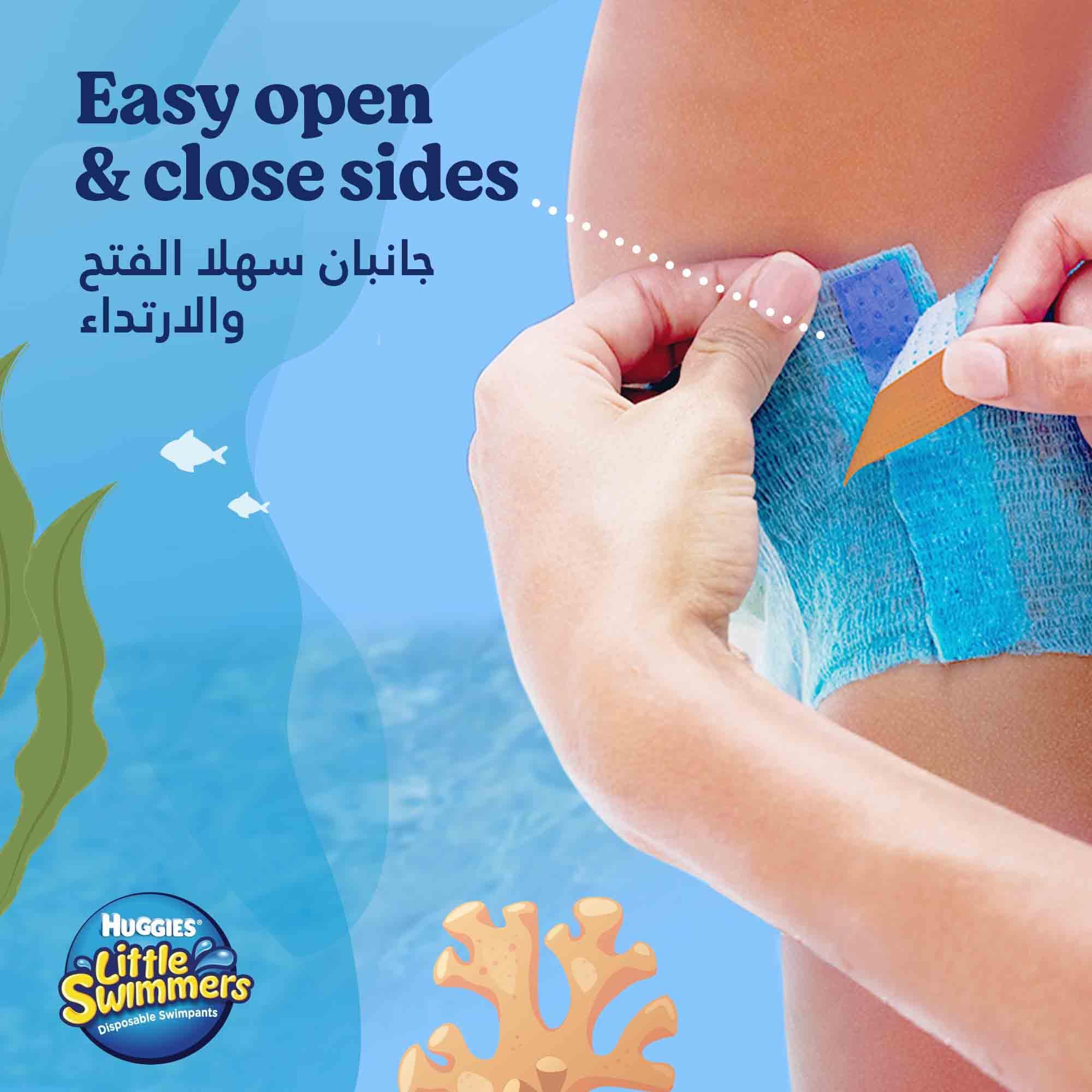 Why swell up like a beach ball when you're playing in the water? HUGGIES Little Swimmers swimpants protect in the water without swelling up like disposable diapers do. And now with Disney designs -even more fun! Available in three sizes to fit infants and toddlers: Small (16-26 lbs.), Medium (24-34 lbs.) and Large (32+ lbs.).