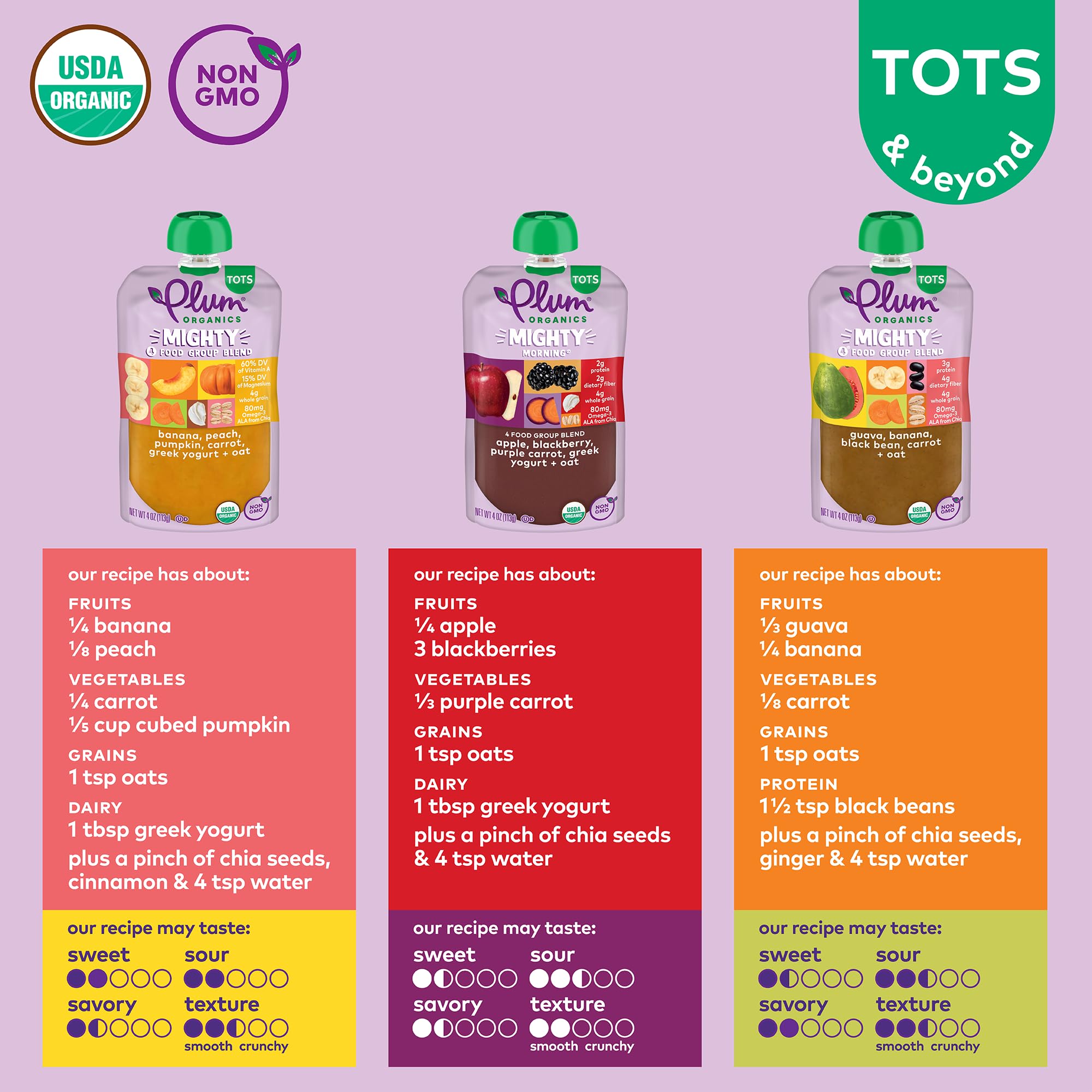 Mighty Blends for a Mighty Toddler. Plum Organics Mighty 4 and Mighty Morning Blends are filled with essential nutrients from 4 food group favorites - organic fruits, veggies, dairy, and grains - for the perfect snack to fuel your active toddler. Our Banana, Peach, Pumpkin, Carrot, Greek Yogurt, and Oat blend, Apple, Blackberry, Purple Carrot, Greek Yogurt, and Oat blend, and Guava, Banana, Black Bean, Carrot, and Oat blend are each made with non-GMO, organic ingredients for an organic toddler food that your toddler will love. Our Plum Organics pouches are naturally preserved, unsalted, unsweetened, and kosher dairy. And since our baby food pouches are convenient, portable, and resealable, you can customize portion sizes, whether you're at home or you need a simple snack on the go.