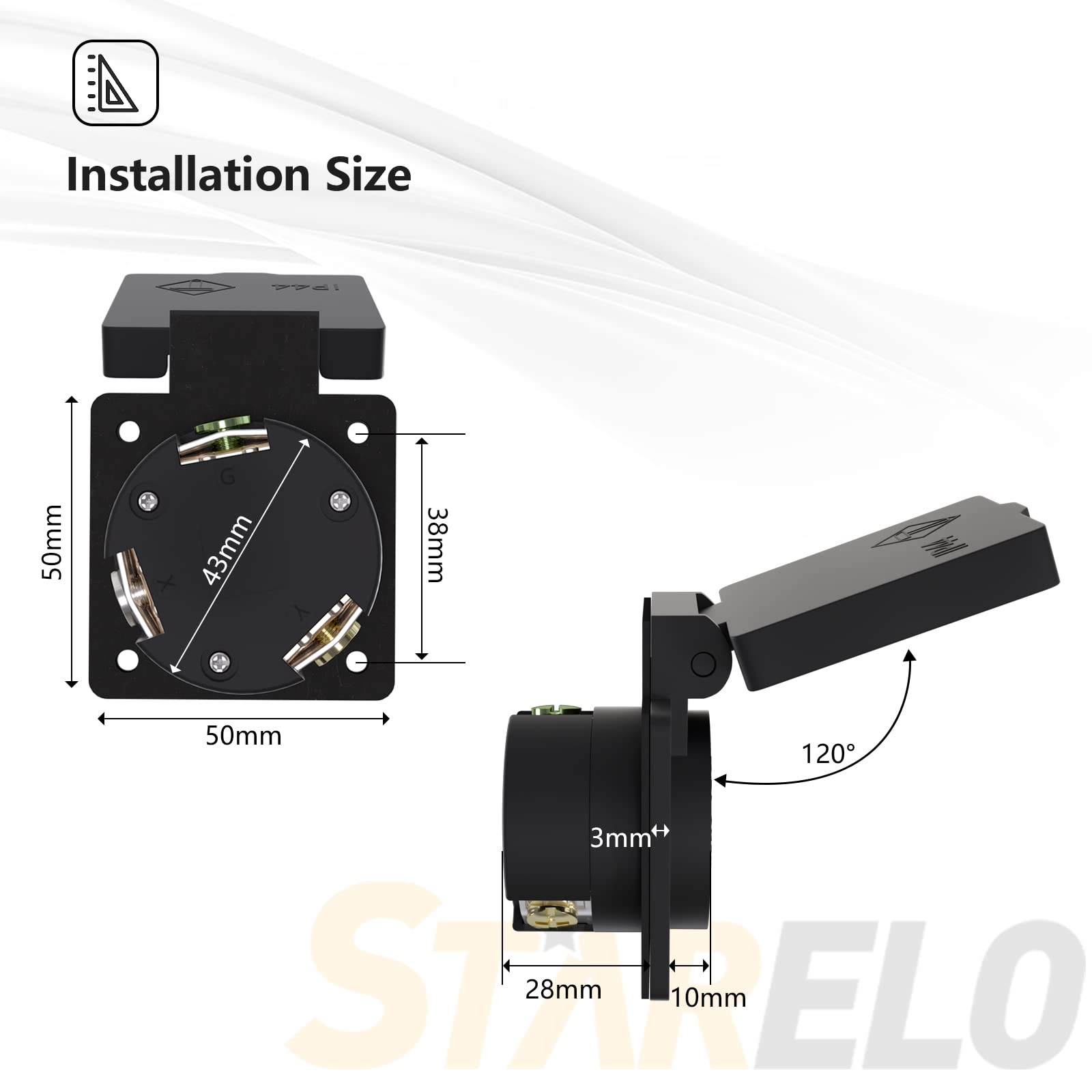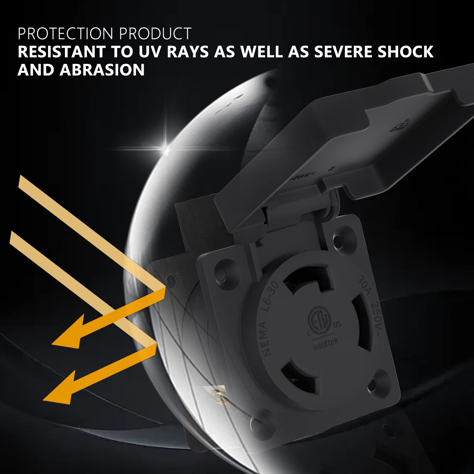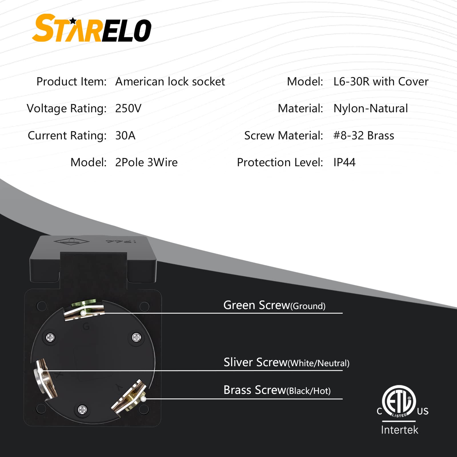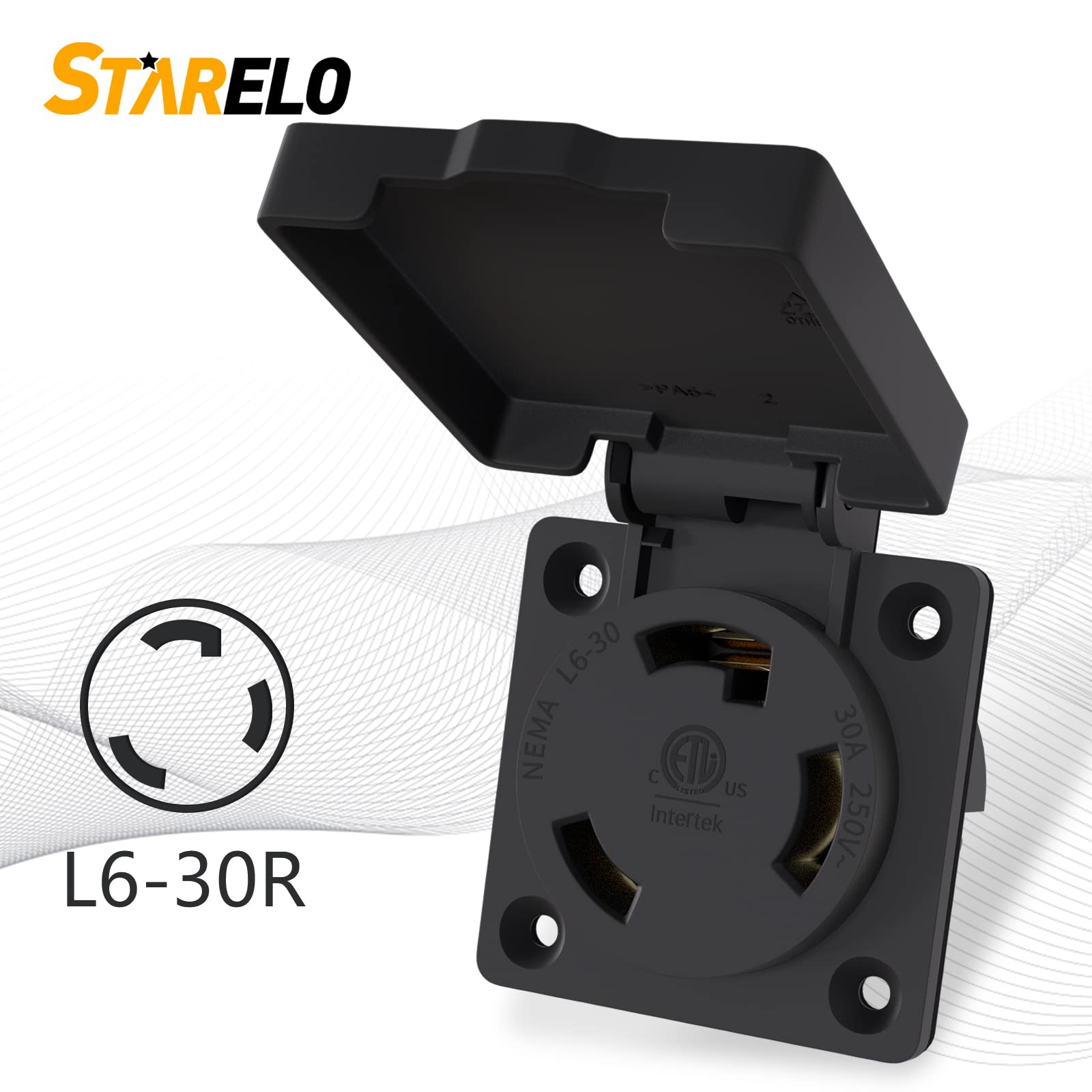 Title: STARELO 30Amp Locking Receptacle for Generator NEMA L6-30R Outlet with Cover,250Volt 2 Pole 3Wire ,Weatherproof, Dustproof and Radiation Proof Locking Power Outlet for Outdoor Use,ETL Listed. Specifications: Color: Black Model: NEMA L6-30R Rated Voltage: 250V Rated Current: 30A Material: ABS Shell