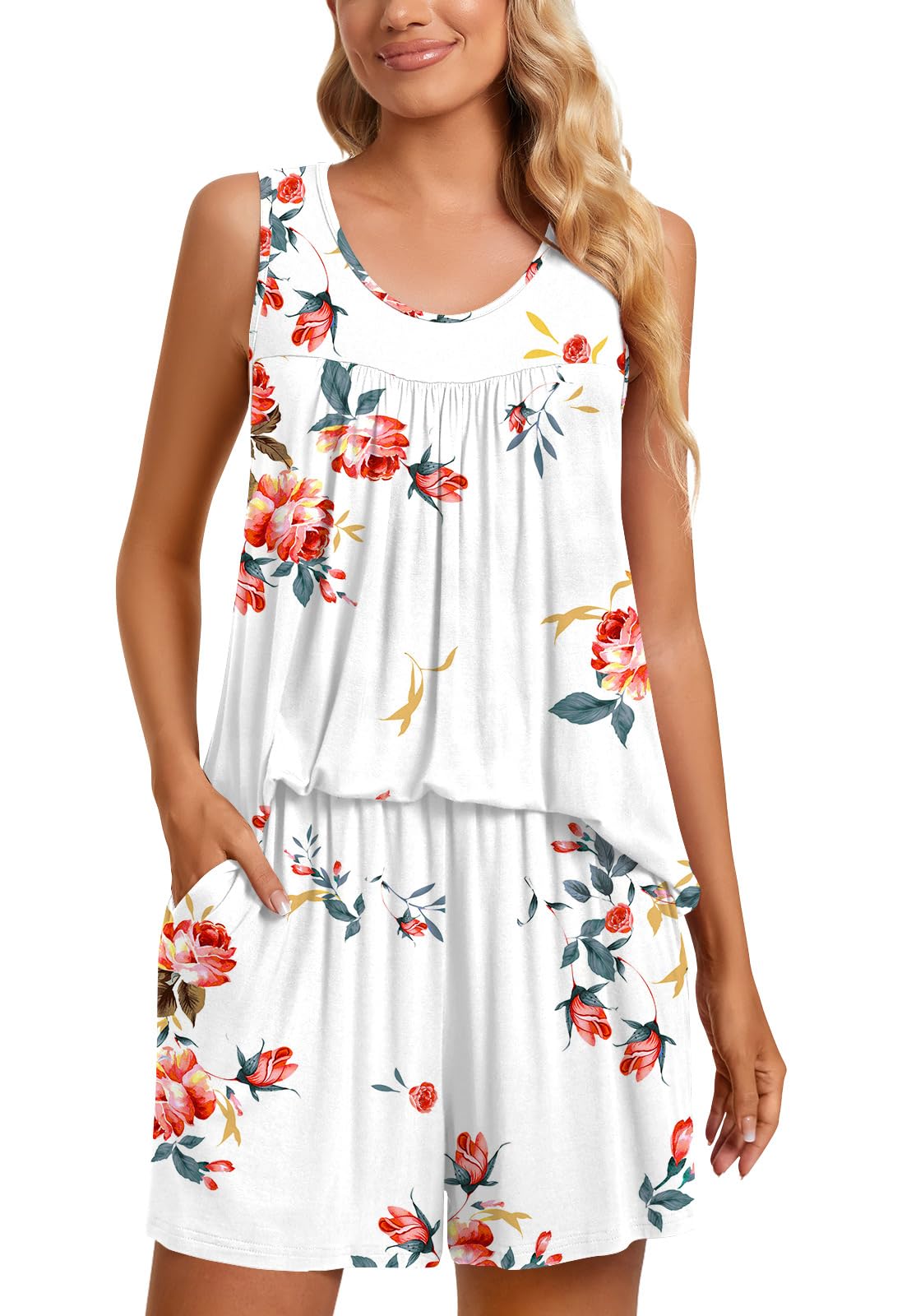 Fashion-Simple Design: Cute two piece outfits, sleeveless tops, soft nightwear, scoop neck and front pleated detailed design. Elastic waistband shorts, casual loose comfy, graceful and easeful
