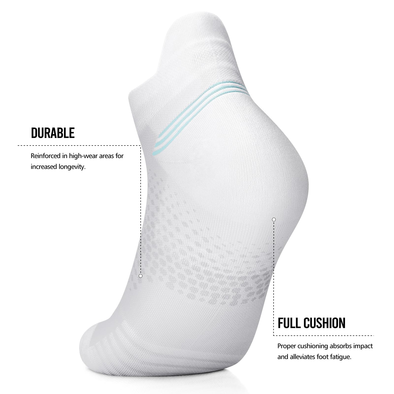 [CUSHION SOLE and ANTI-BLISTER]: Womens running socks with great soft cushion at the bottom, heel and toe areas to absorb shock and relieve foot pain. The Y-stitched heel pocket and elasticated band prevents socks from slipping and blisters from forming