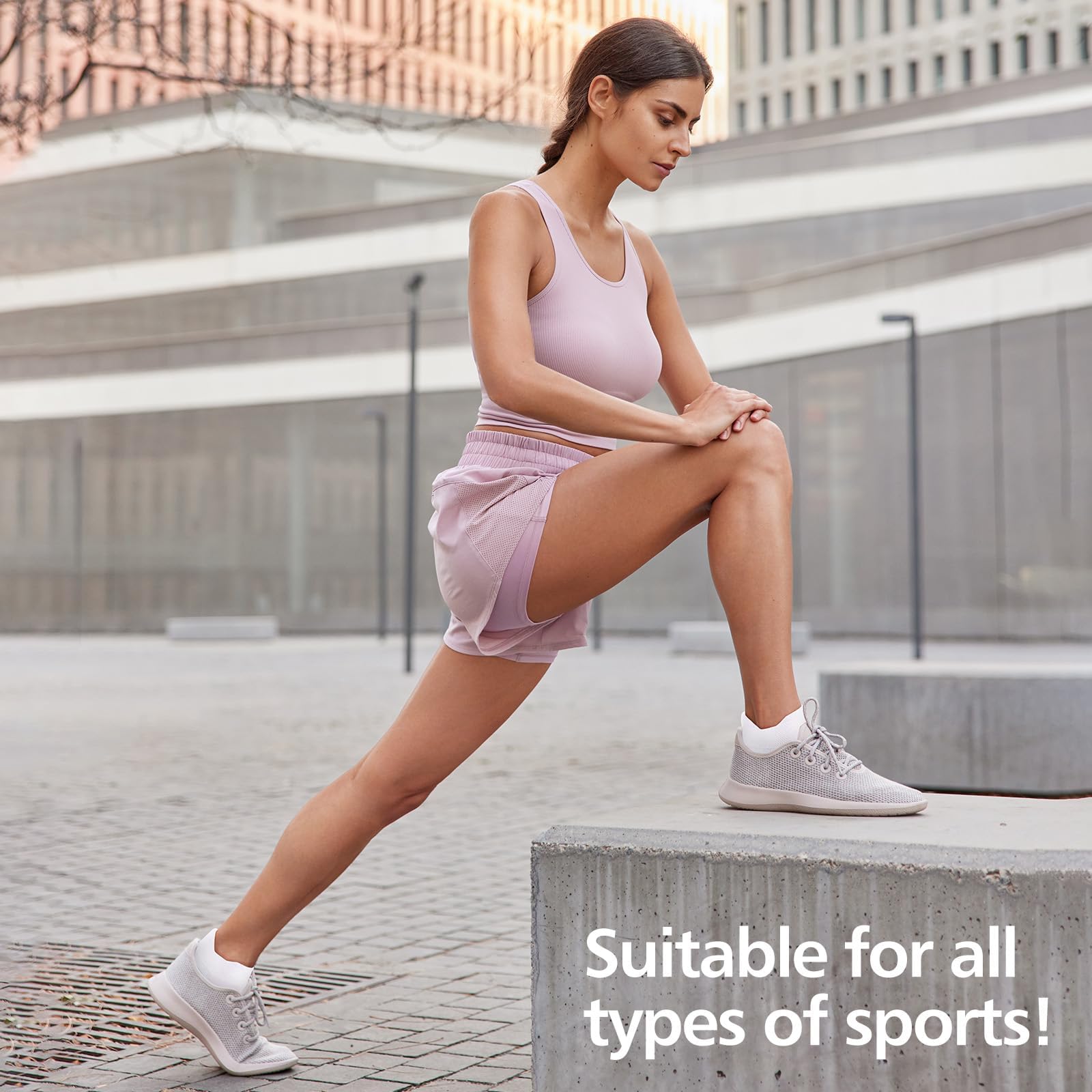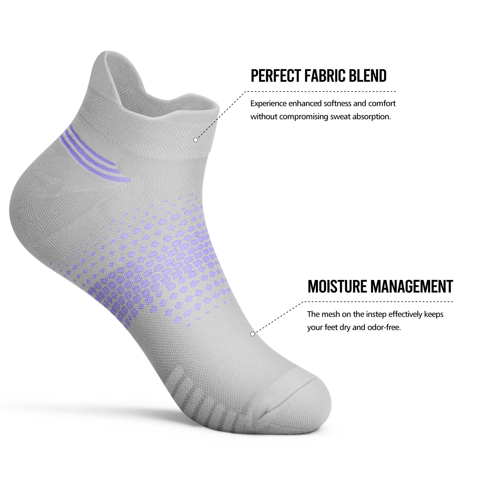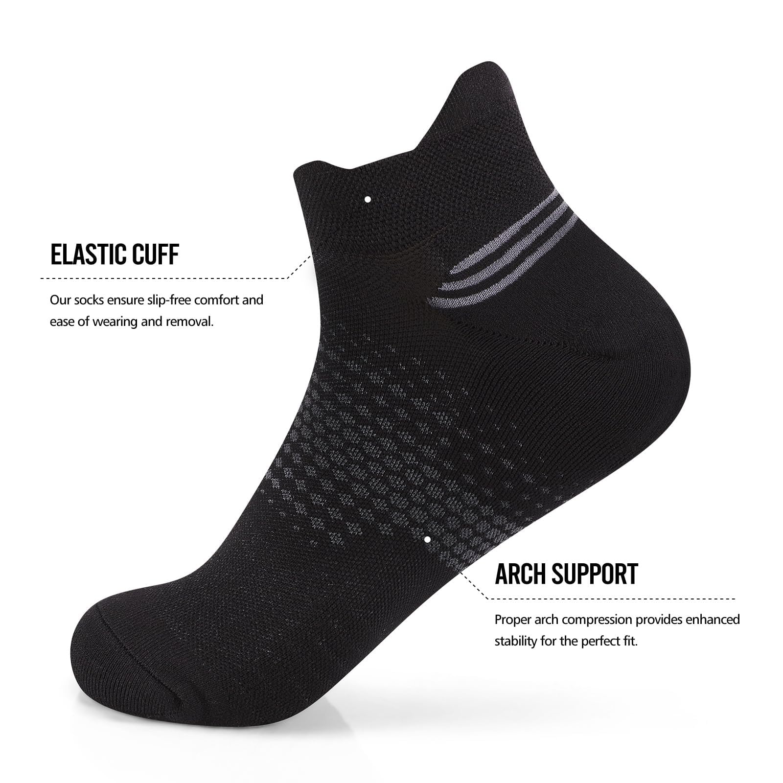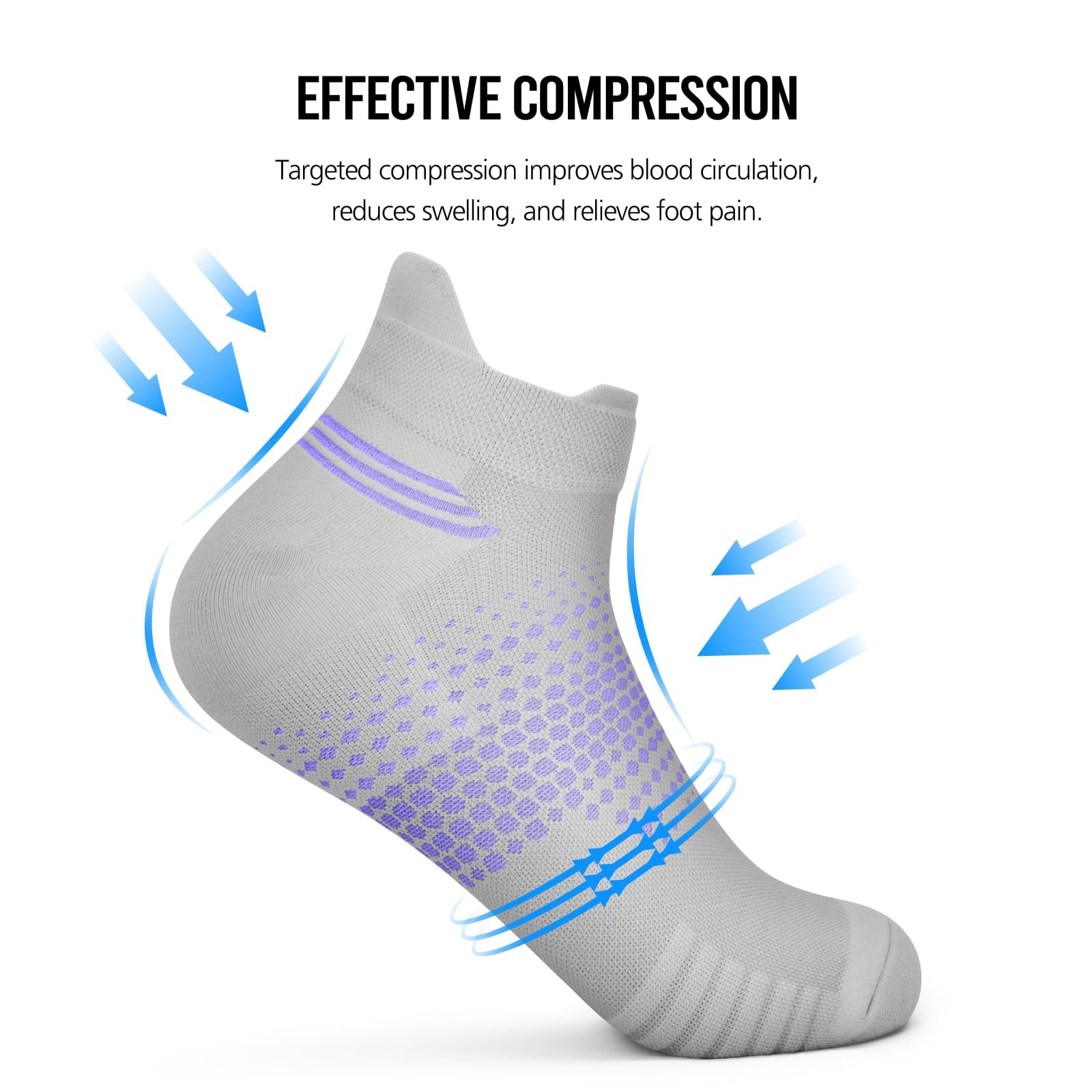 [ARCH SUPPORT]: Compression ankle socks(8-15 mmHg) provide all-round athletic support for stability. The women's compression socks with compression band at the arch and targeted compression zones promote blood circulation and relieve foot fatigue during running