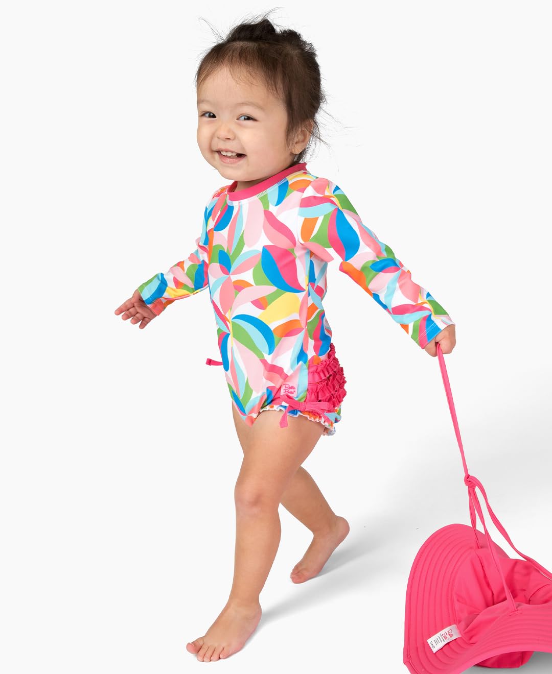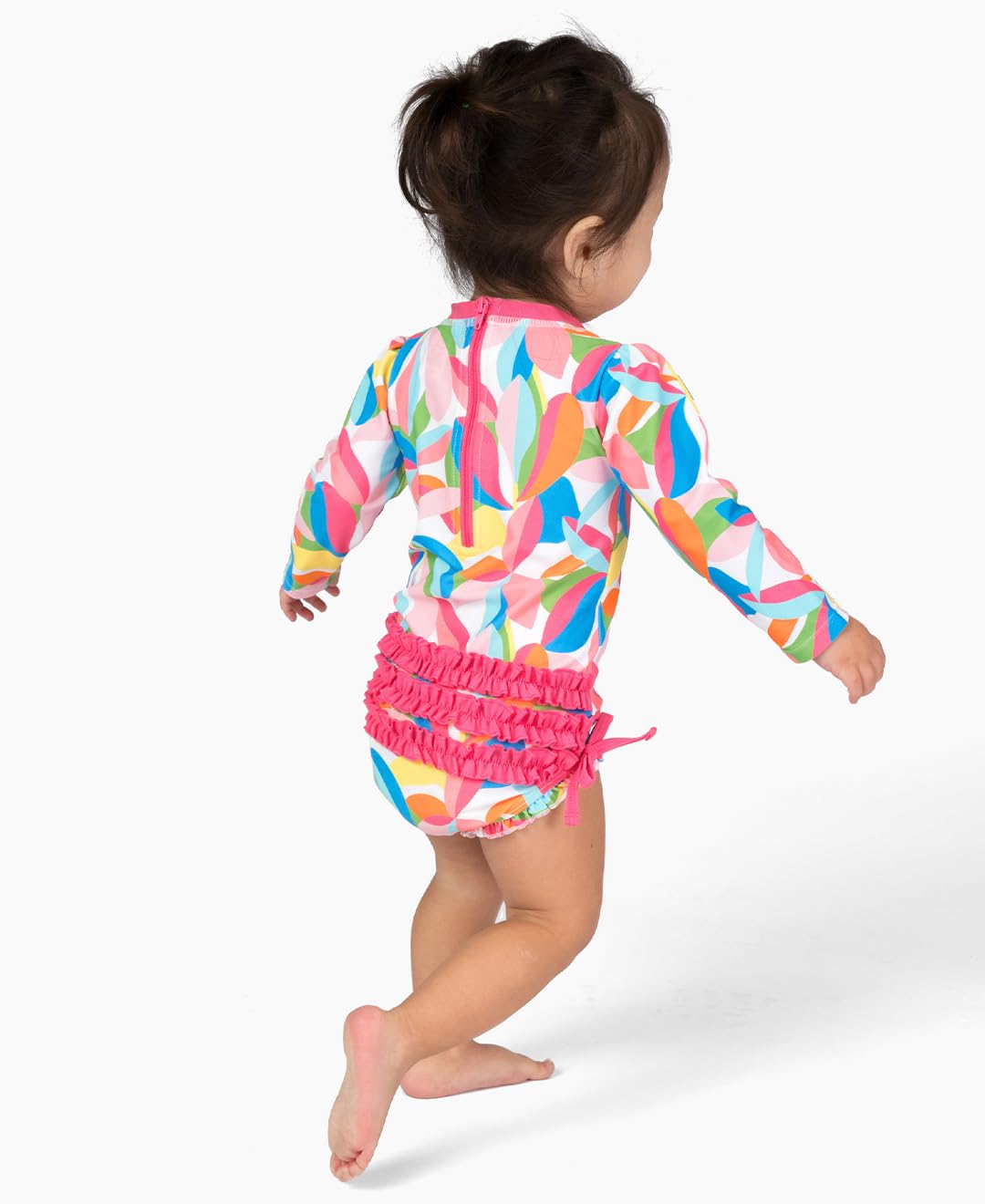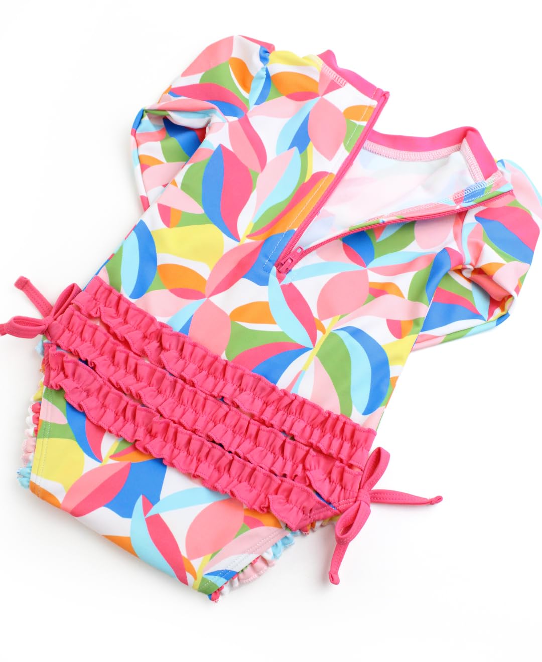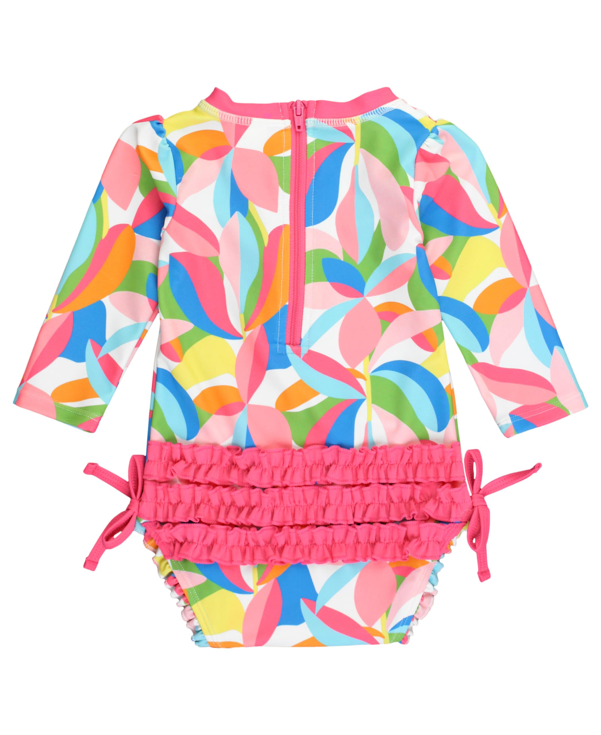 Description A wonderful addition to your little girl's swimwear, this Tropical Baby One Piece Rash Guard is comfort and style rolled into one. Unlined with snaps at bottom that make for easy changing. Made with sun protected fabric for all day protection and comfort.