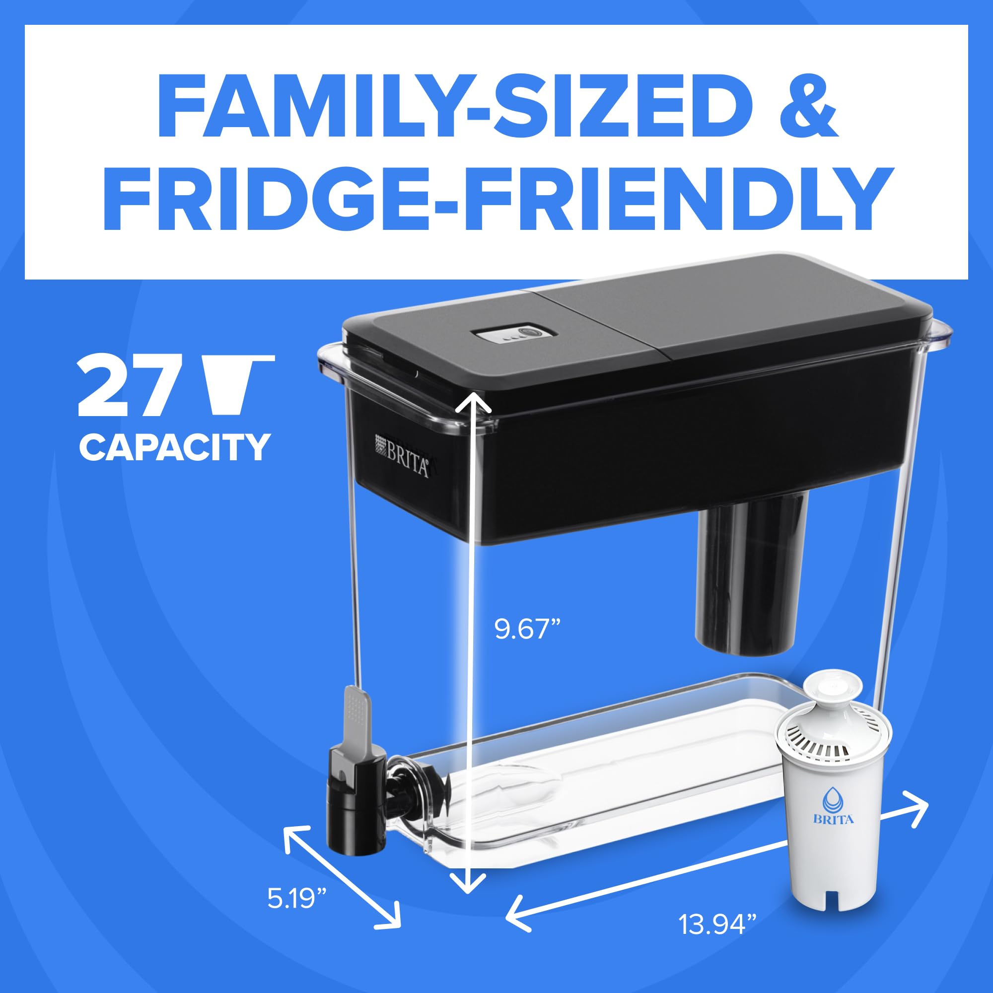 Drink healthier, great-tasting tap water with the BPA-free, large 27-cup Brita UltraMax Water Dispenser. This water filtration system cuts the taste and odor of chlorine, plus it reduces mercury, copper and other impurities to deliver great-tasting drinking water. By switching to this Brita water purifier, you can replace 1,800 single-use plastic water bottles a year to stay hydrated, save money and reduce plastic waste. This space-efficient Brita water dispenser is fridge-friendly and features an easy-locking lid and precision-pour spigot. The handy sticker filter indicator lets you know when it's time for a filter change. This Brita water dispenser comes with one Standard Brita water filter, but it's compatible with both Elite and Standard water filters. For the freshest-tasting water, replace your Elite filter after 120 gallons or approximately every six months, or replace your Standard filter after 40 gallons or approximately every two months. Get great taste, less waste and more savings from Brita.