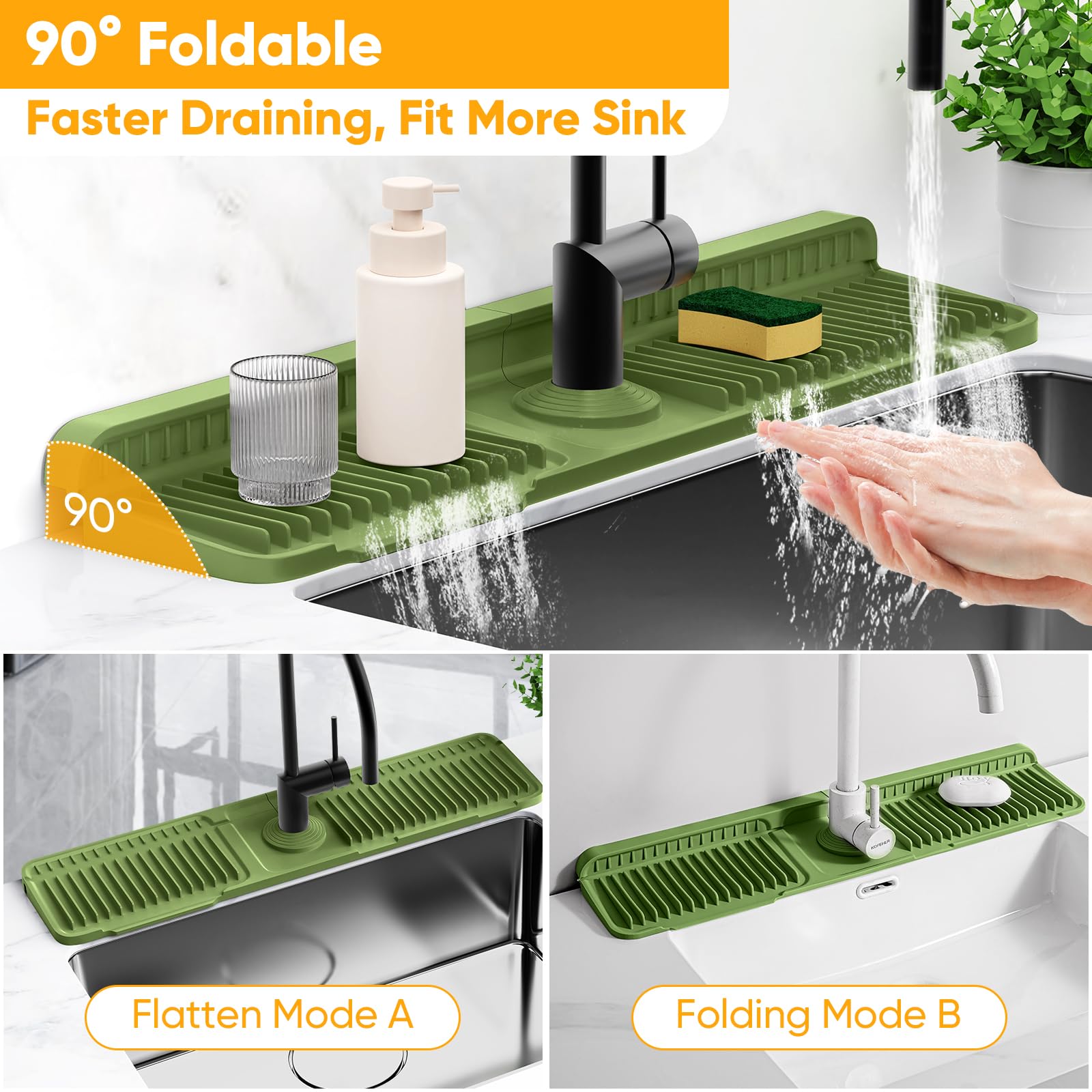 😎【90° Foldable Better Draining, Fit More Sinks】 The back is flexible meaning if you don't have much space back there, You can fold the sink faucet mat splash guard by 0-1.2 inch to use and if you have more space, It can be stably laid flat on your countertops. The 90° foldable design allows easy attachment to the wall, fitting various sink countertops. This durable silicone sink splash guard keeps your sink dry and tidy while efficiently draining water for ultimate kitchen convenience.