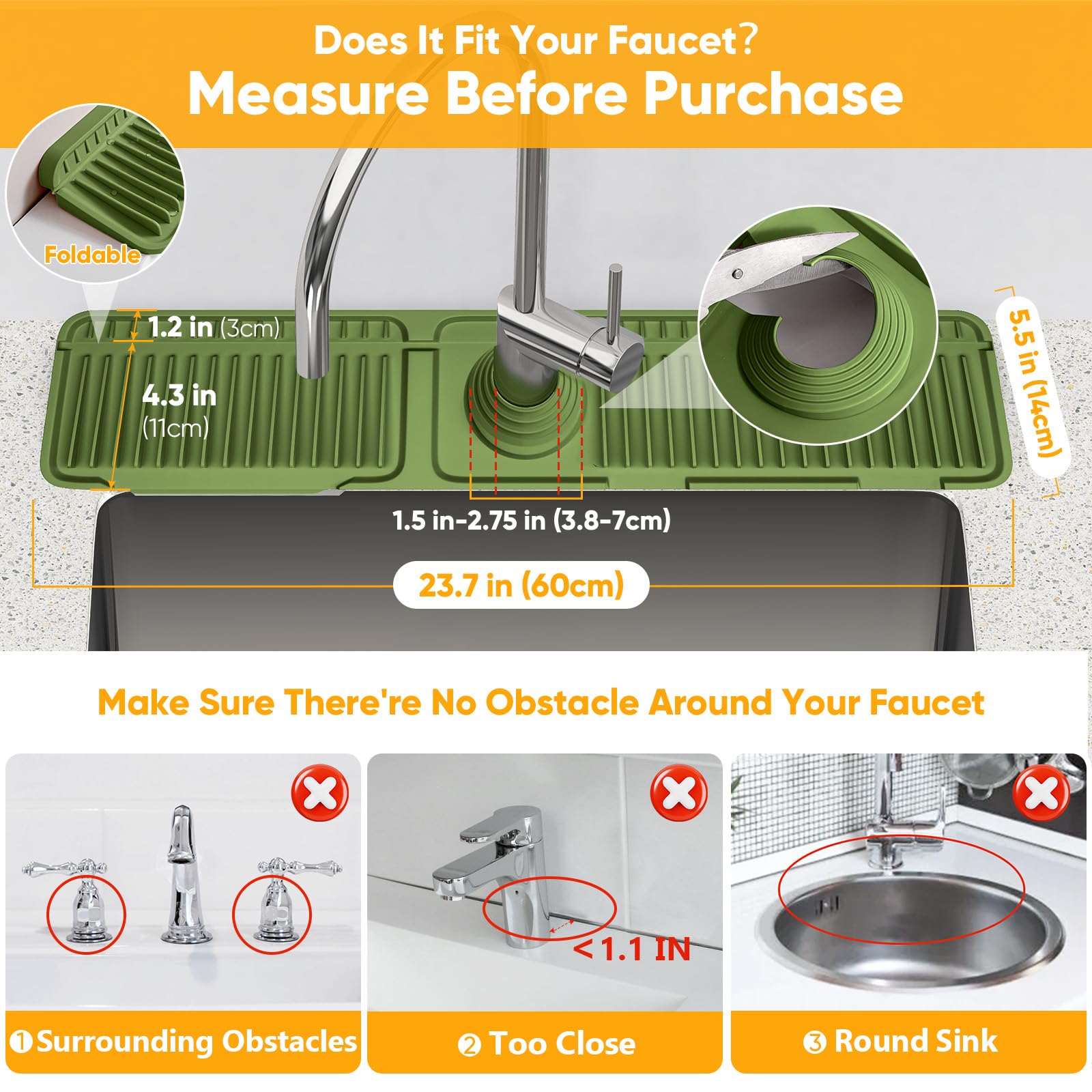 🚩【𝐅𝐮𝐥𝐥𝐲 𝐅𝐥𝐚𝐭 𝟐𝟒" 𝐱 𝟓.𝟓" 𝐀𝐫𝐞𝐚 𝐑𝐞𝐪𝐮𝐢𝐫𝐞𝐝】Please Keep a 𝟐𝟒" 𝐱 𝟓.𝟓" clear space around your faucet. free of built-in filters, or hand soap dispensers, unless you are willing to cut the mat to let it can be laid flat. If you need to cut, You can put a couple slash marks in the product back to go around the soap dispenser. It is simpler and keeping the water out. (But Cutting Requires Skill) So it's best to ensure there are no obstacles, NOT Applicable for curved rims sink, side sink, round sink, thick faucet base.