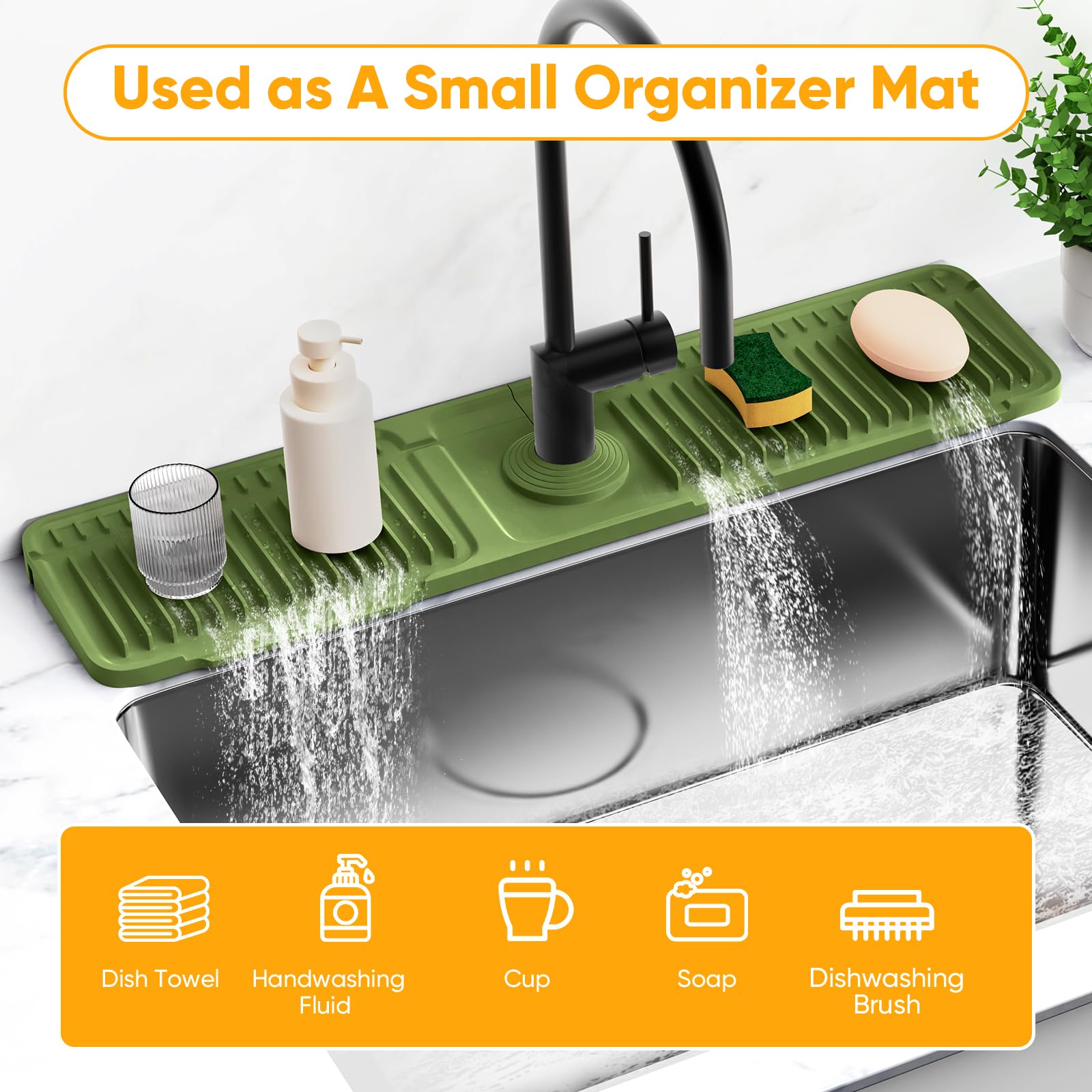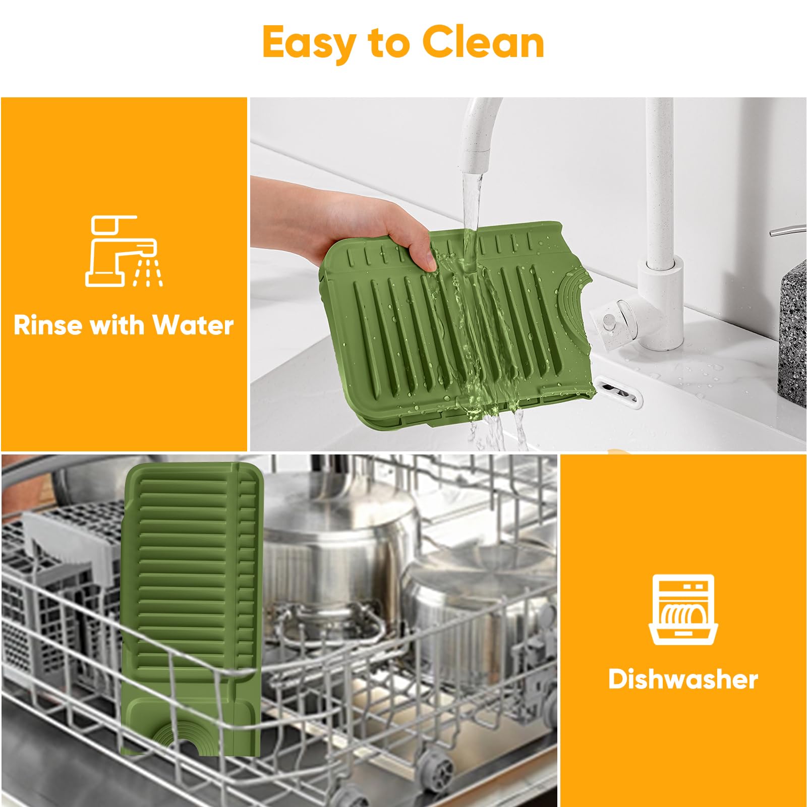 👍【100% Silicone Material, Easy to Clean】Give up those wet faucet mat are made from hard-to-clean fabric that takes a lot of time to dry, our product is made from 100% silicone, will catch the water and fast self-draining to your sink. The silicone is soft and reliable, reusable and durable, won't scratch your utensils, totally safe to use. You can rinse the product with running water or dishwasher after multiple uses to fresh new the silicone sink protector, perfectly suit modern kitchen style