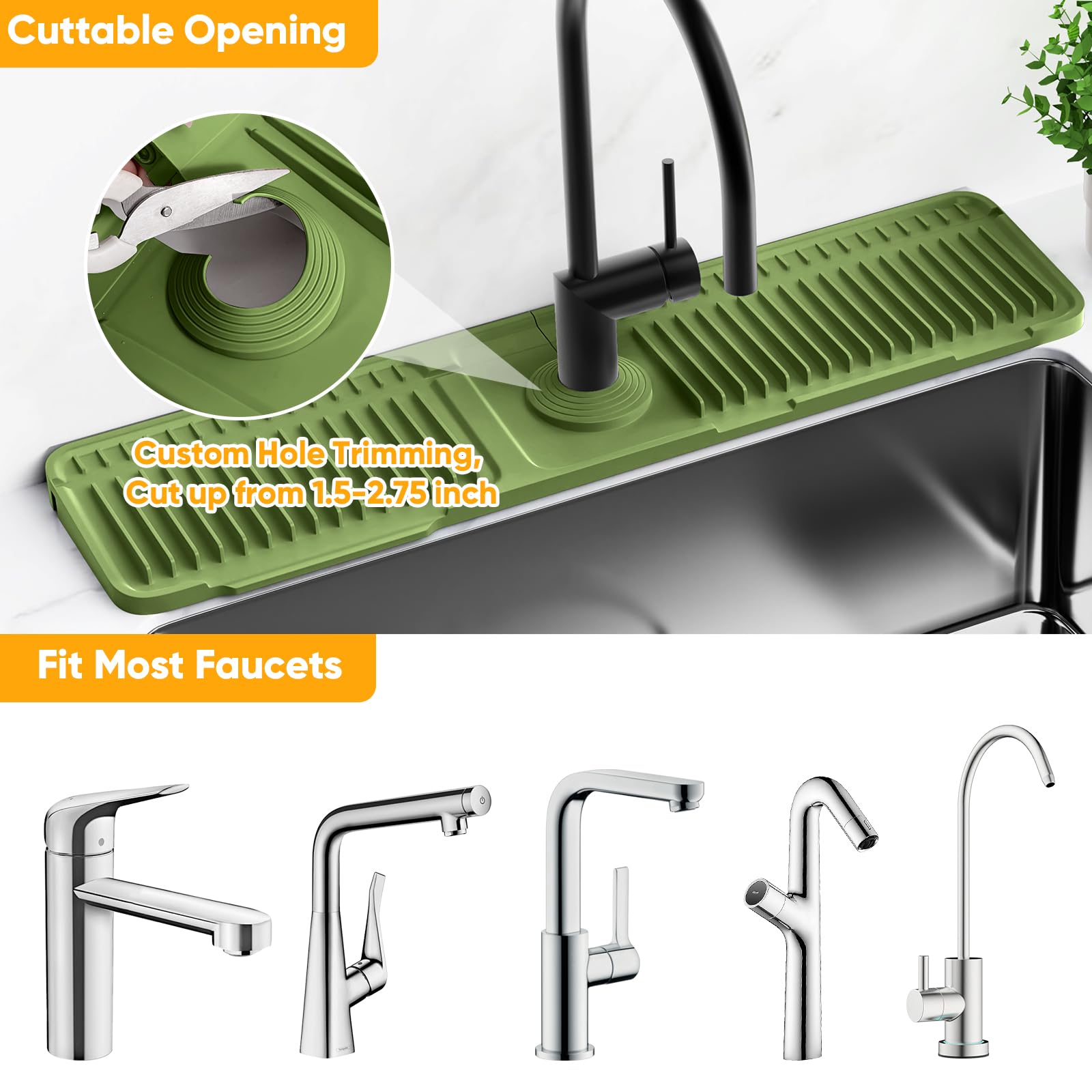 🍀【Cuttable Hole Design, Fits Perfectly without Leak】To prevent the hole for the faucet is far too big which may allow water to collect around the cutout for faucet, Snoquir sink splash guard behind faucet adopt a cuttable hole design, you can cut the faucet guard draining mat hole to fit the faucet tap, so that the kitchen faucet mat can fit perfectly without leak. The cuttable hole design also make it fits most faucet diameters.