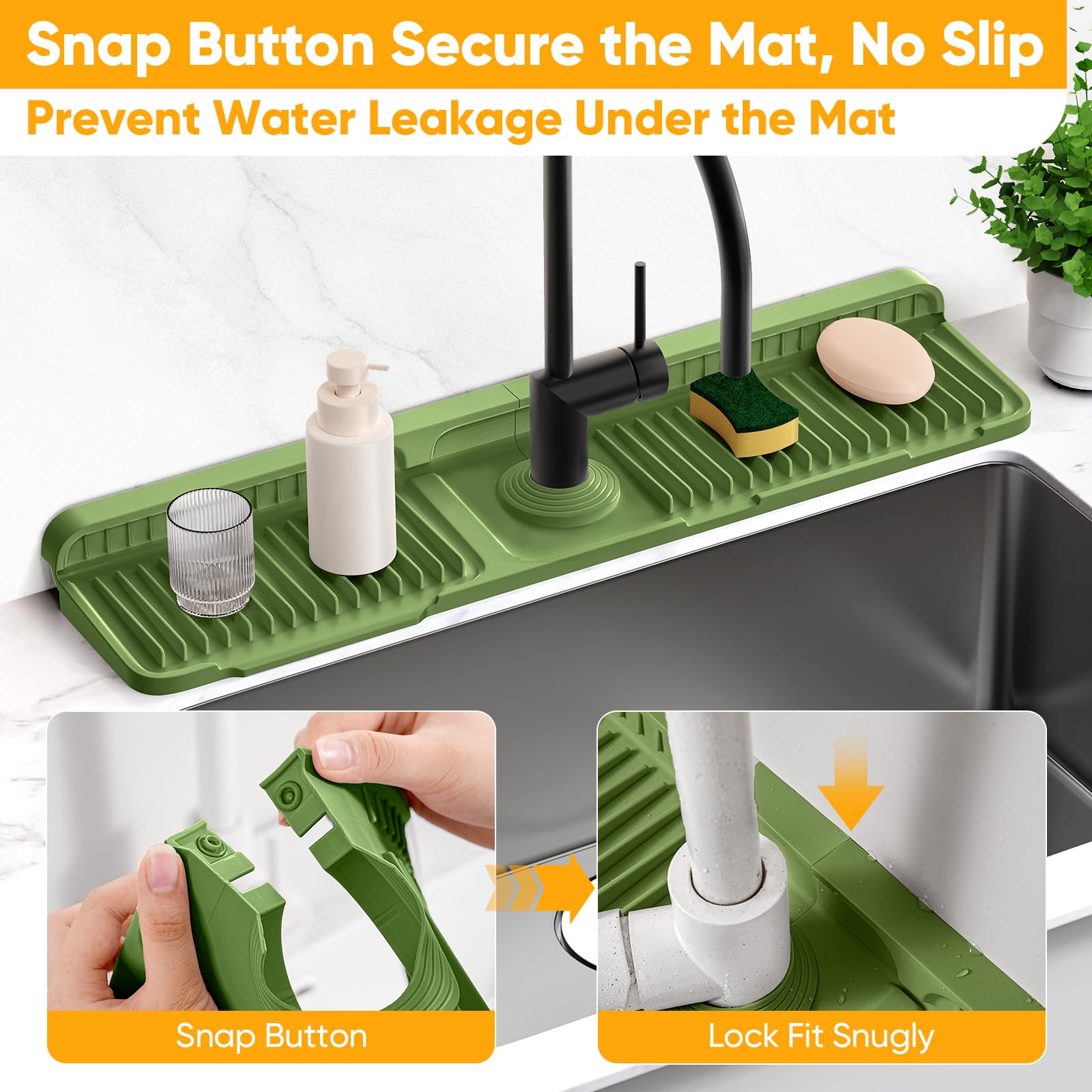 💯【Snap Button Lock, Prevent Water Gets Underneath】Innovative fastening snap button lock design can link the product's two ends together behind faucet to hold the product firmly in place without detaching or sliding towards the sink. It can also ensures the product leaves no gaps behind the back, and good sealing to prevents water from entering. Just place our kitchen sink splash guard under the faucet and fasten the button for full countertop protection.