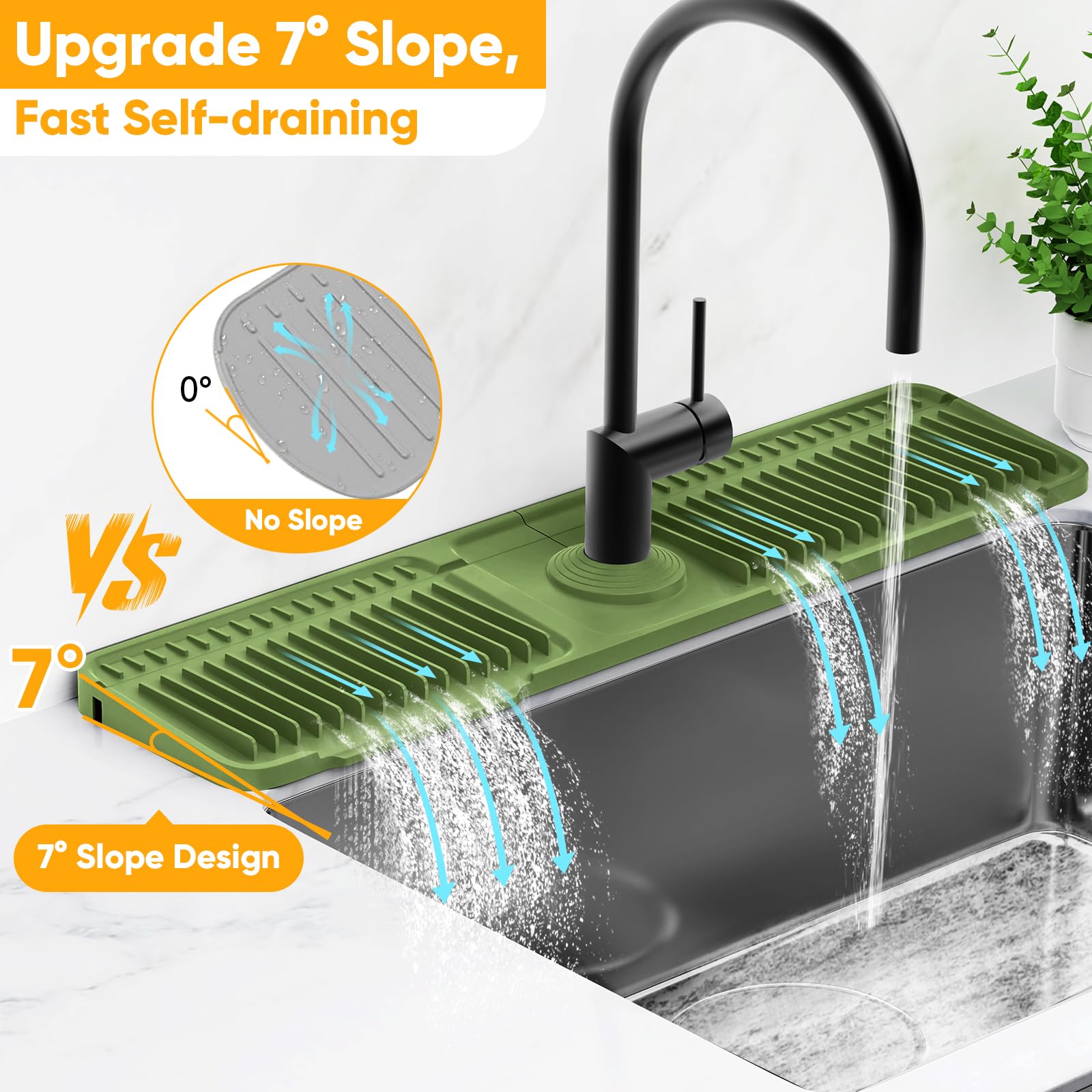 🏆【7° Slope Design, Fast Self-Draining】 No more wiping the faucet base endlessly from now on. Snoquir faucet mat for kitchen sink have increased the size, thickness and weight. Latest 7° slope design allows for faster and smoother water discharge and faster drying. This means no puddles to clean up & no water spots around the faucet. The tidy splash faucet guard & draining mat behind faucet prevents water stains from the faucet splashing or leaking. Give your kitchen sink an effort-saving upgrade!