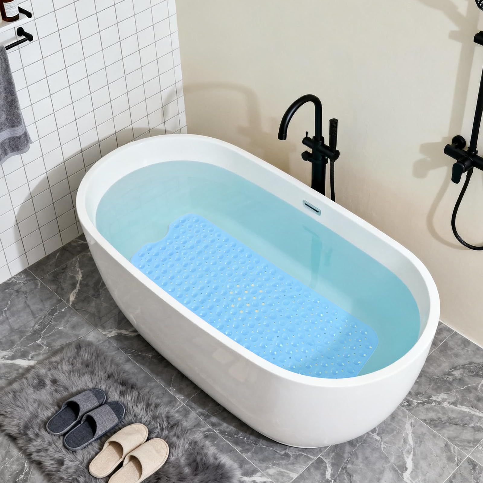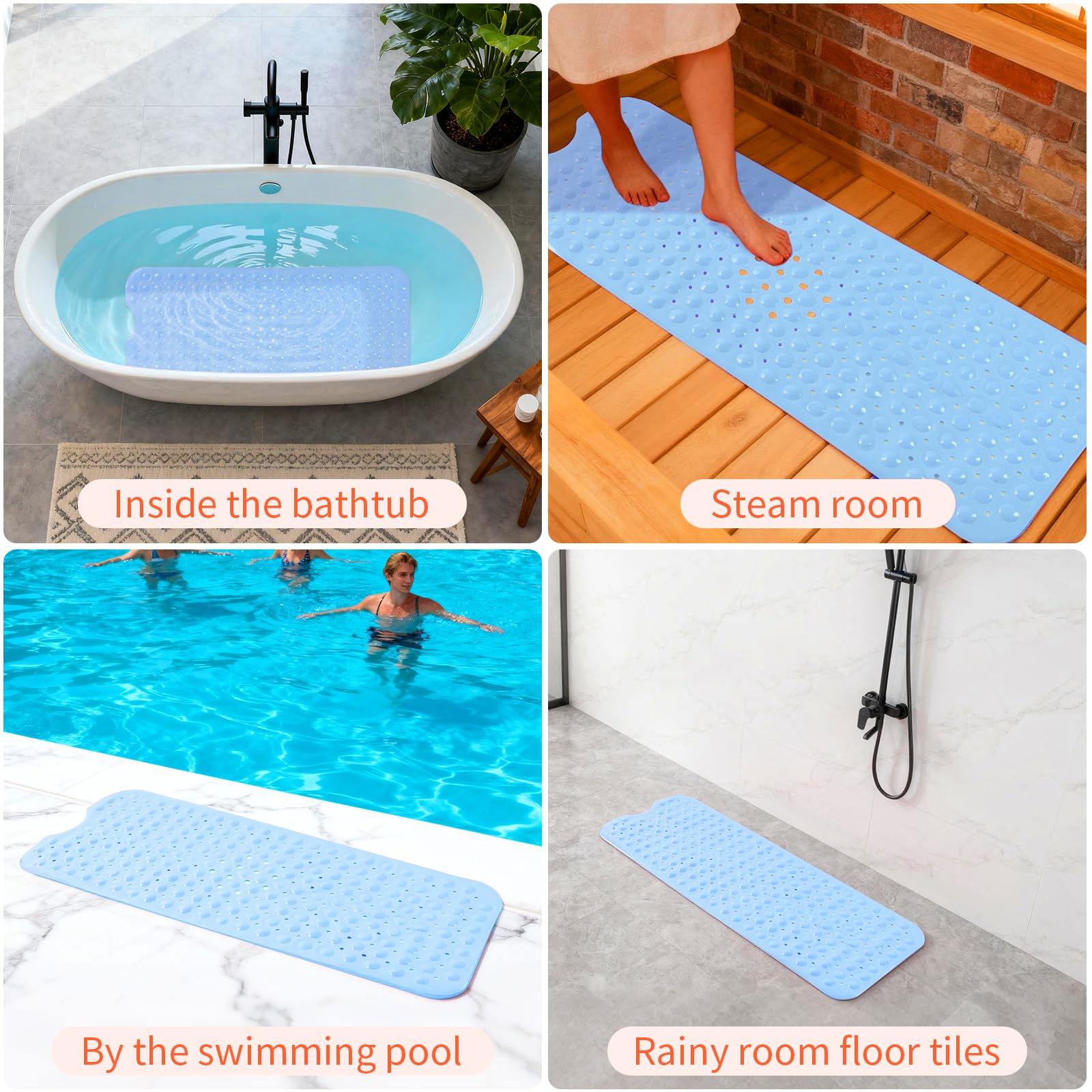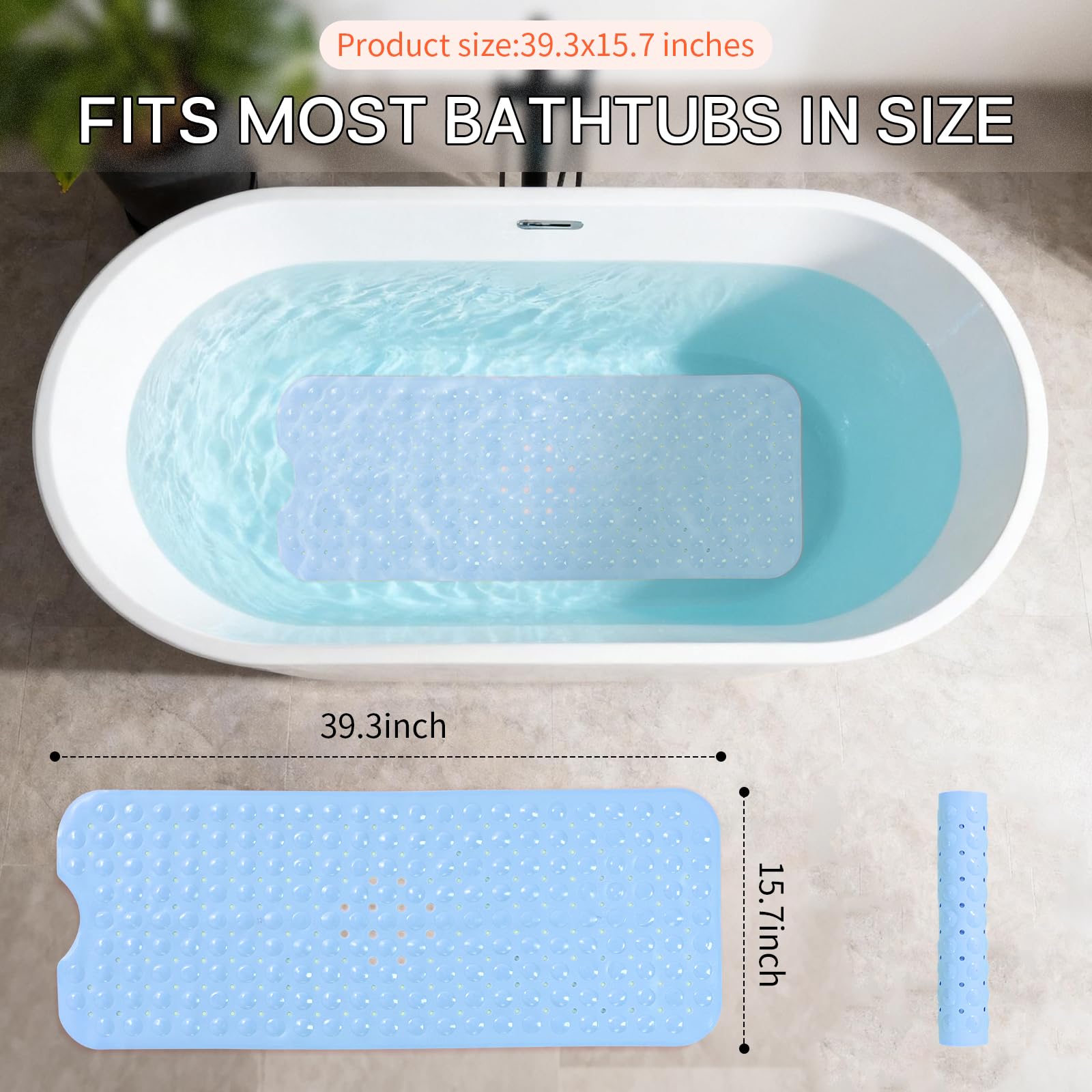 NON-SLIP LARGE BATH MAT: Our non-slip large bathtub mat offers superior coverage with its 39.3×15.7 inch(Approximately 100 × 40cm, with an error of about 1cm) size, maximum coverage for the bathtub floor. Equipped with 200 special large suction cups, this mat securely stays in place on smooth, clean surfaces, making it ideal for home, spa, sauna, gym baths, and showers.