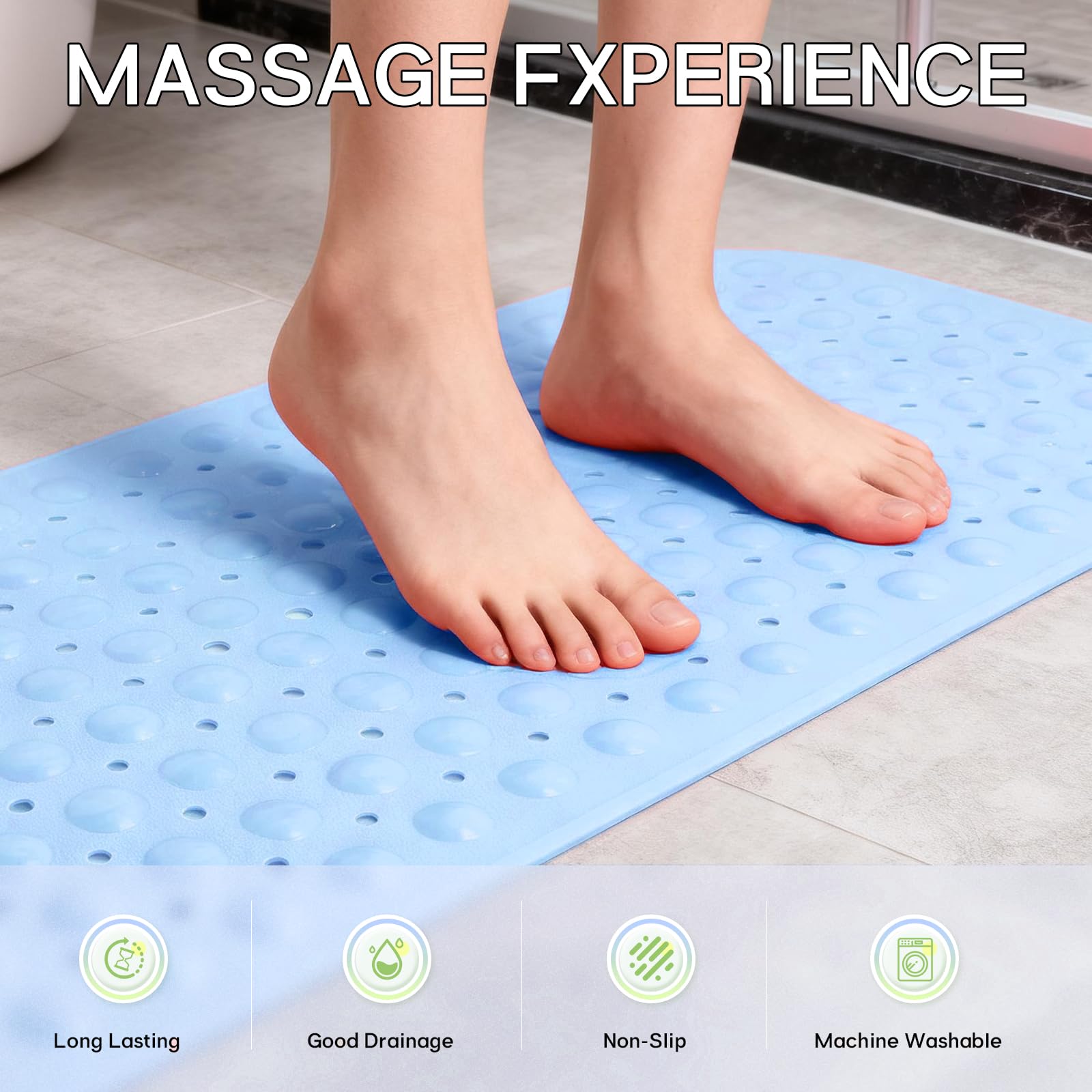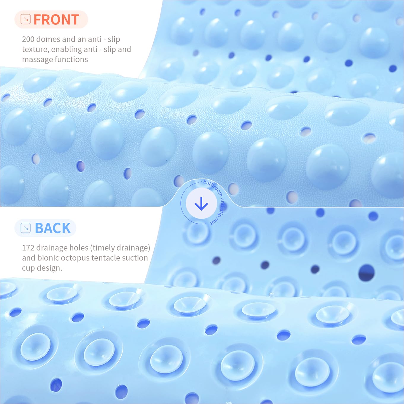 FUNCTIONAL BATHROOM MAT: Our versatile bath mat features a domed design resembling pebbles, offering a massage-like experience during shower time. The irregular texture on the surface enhances friction and prevents slipping. Additionally, with 172 small drain holes, water circulation is optimized and smoother drainage.