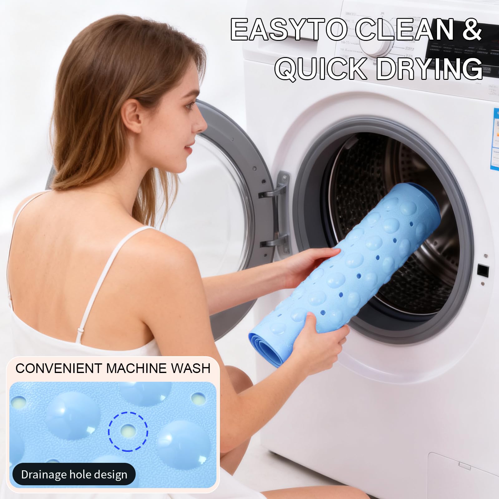 MACHINE WASHABLE: Conveniently machine-washable and easy to maintain, this non-slip bathtub mat can be effortlessly cleaned. Simply toss it into the machine and wash it on a cold water setting. Afterward, hang it to dry. We recommend periodically rinsing and air-drying the shower mat.