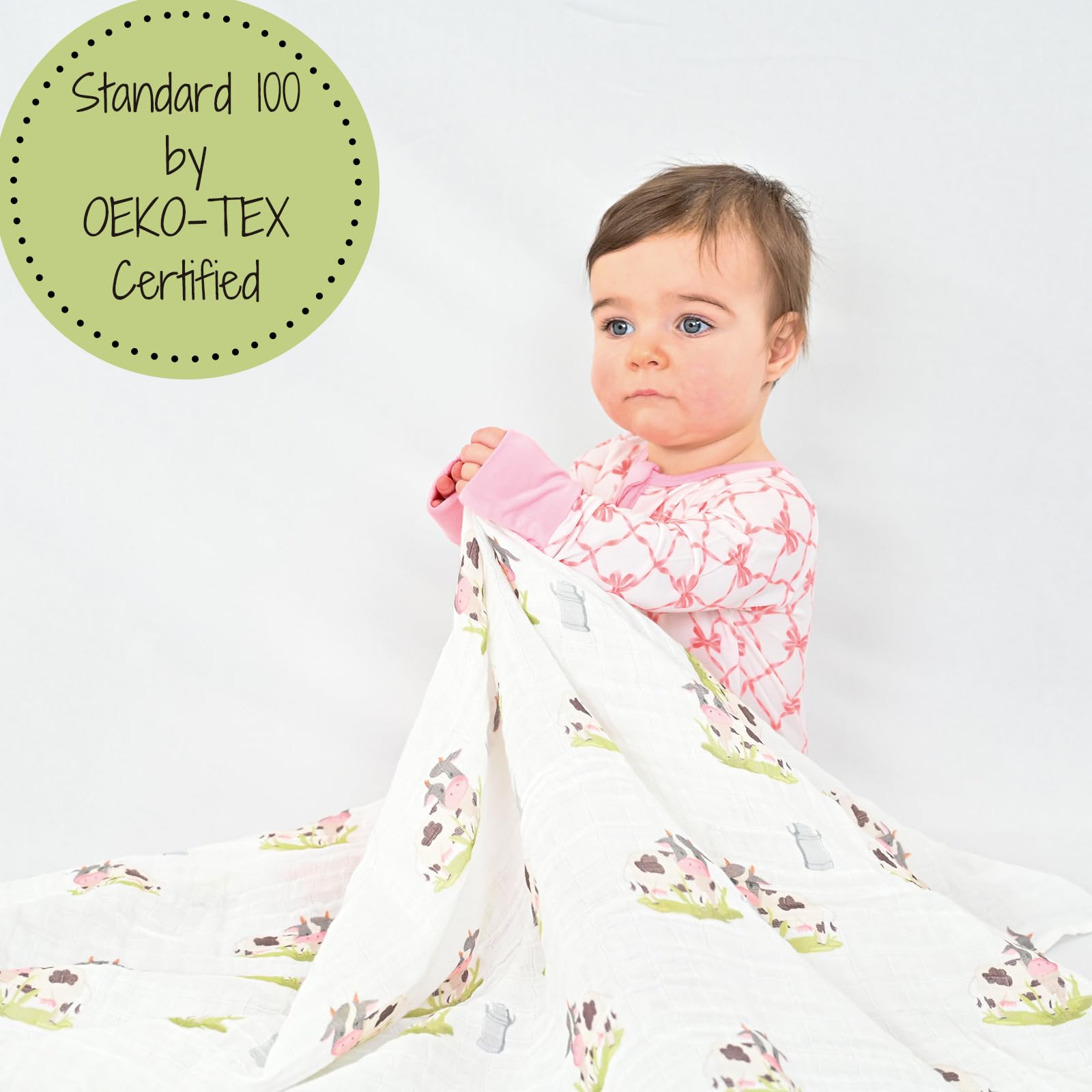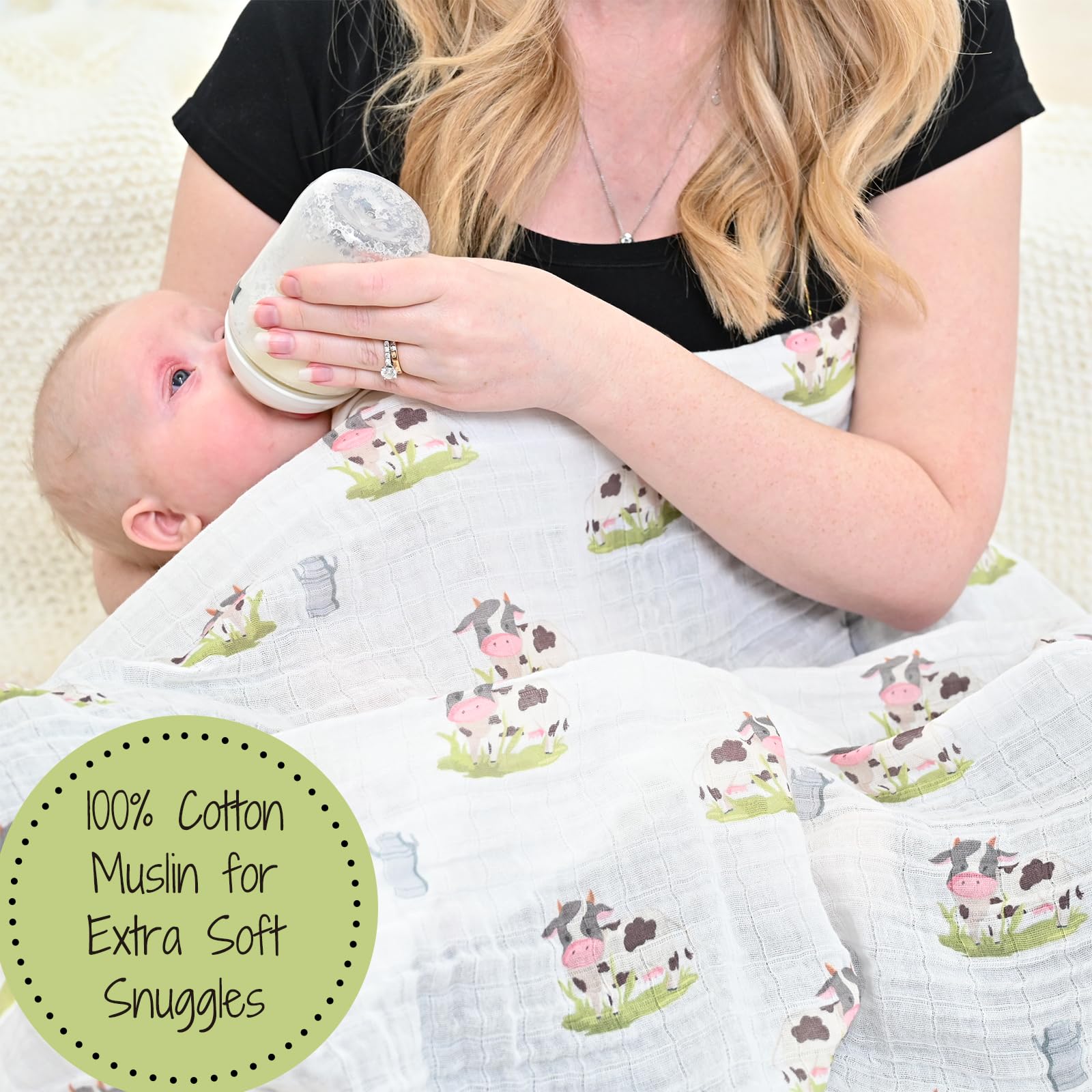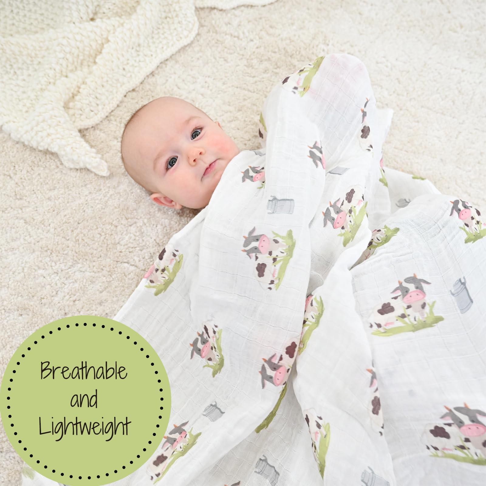 FARM FRESH - Our muslin swaddle with a playful cow print brings a touch of farm charm to your baby’s snuggle time. Cozy yet breathable, it’s a delightful wrap for farm-loving families.