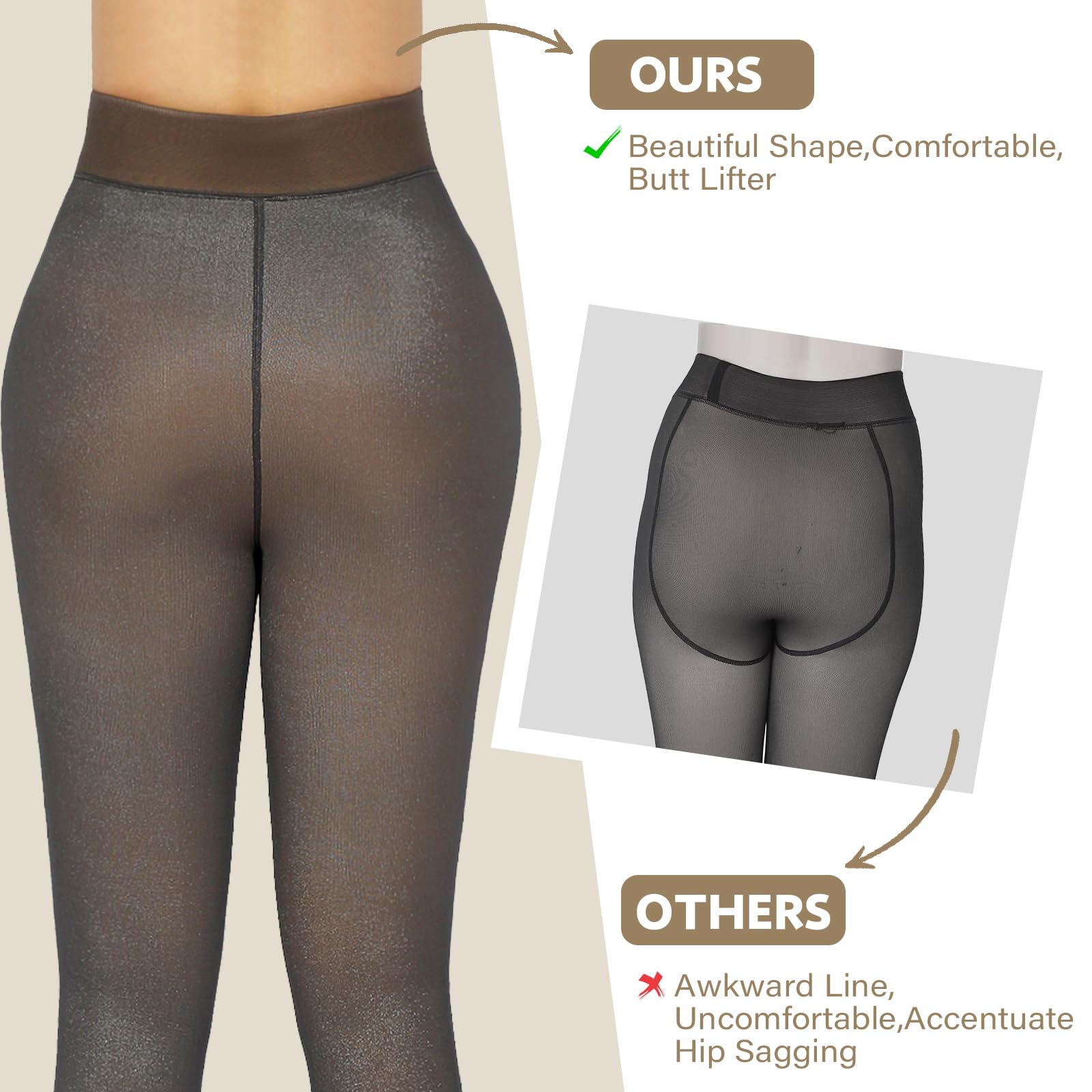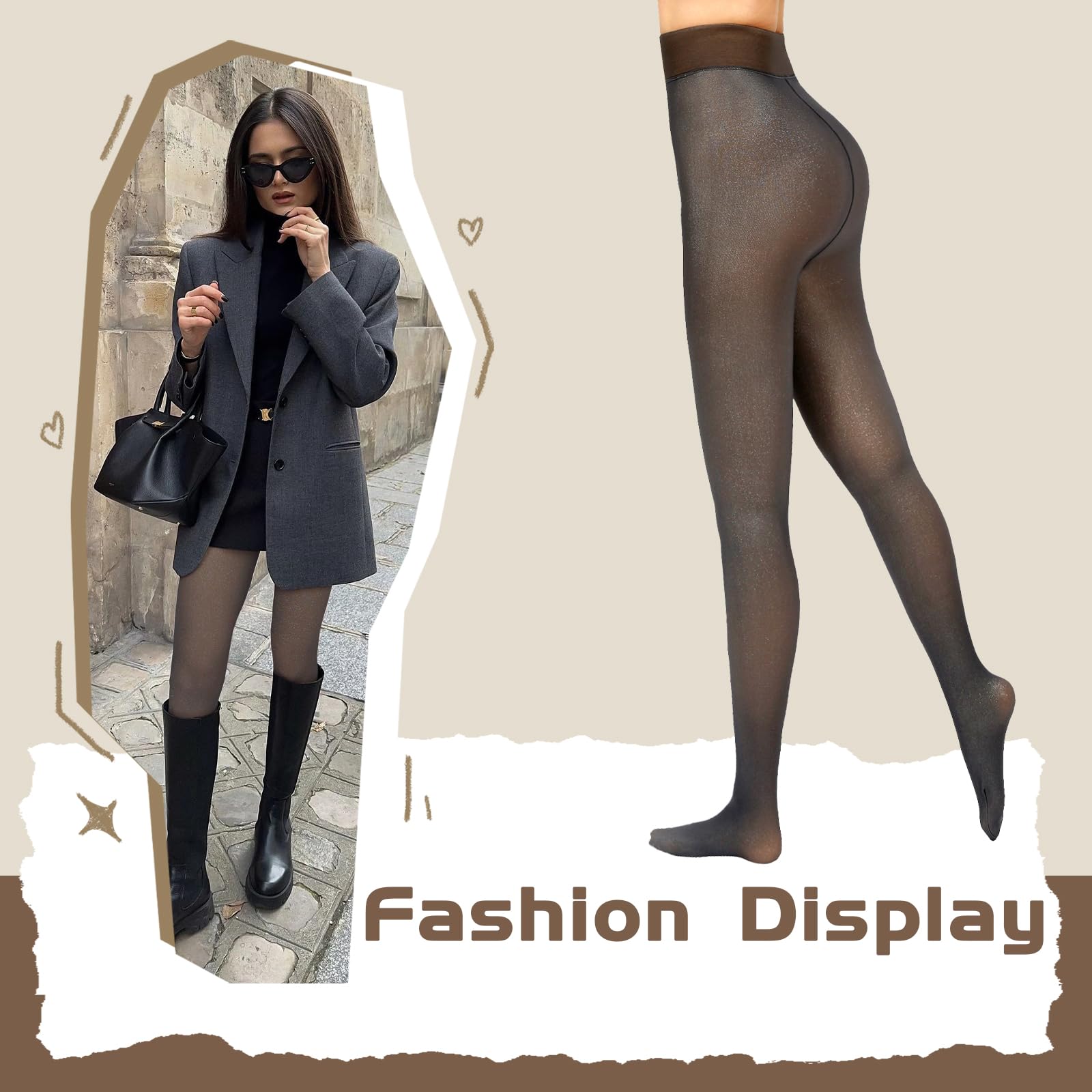 【Fake Translucent pantyhose】:This translucent fleece leggings are fashionable. The winter tights look like a sheer stocking from the outside but fill with warm fleece in the inside.You wear this fake translucent tights in autumn and winter, not only to show your sexy figure, but also to keep you warm.