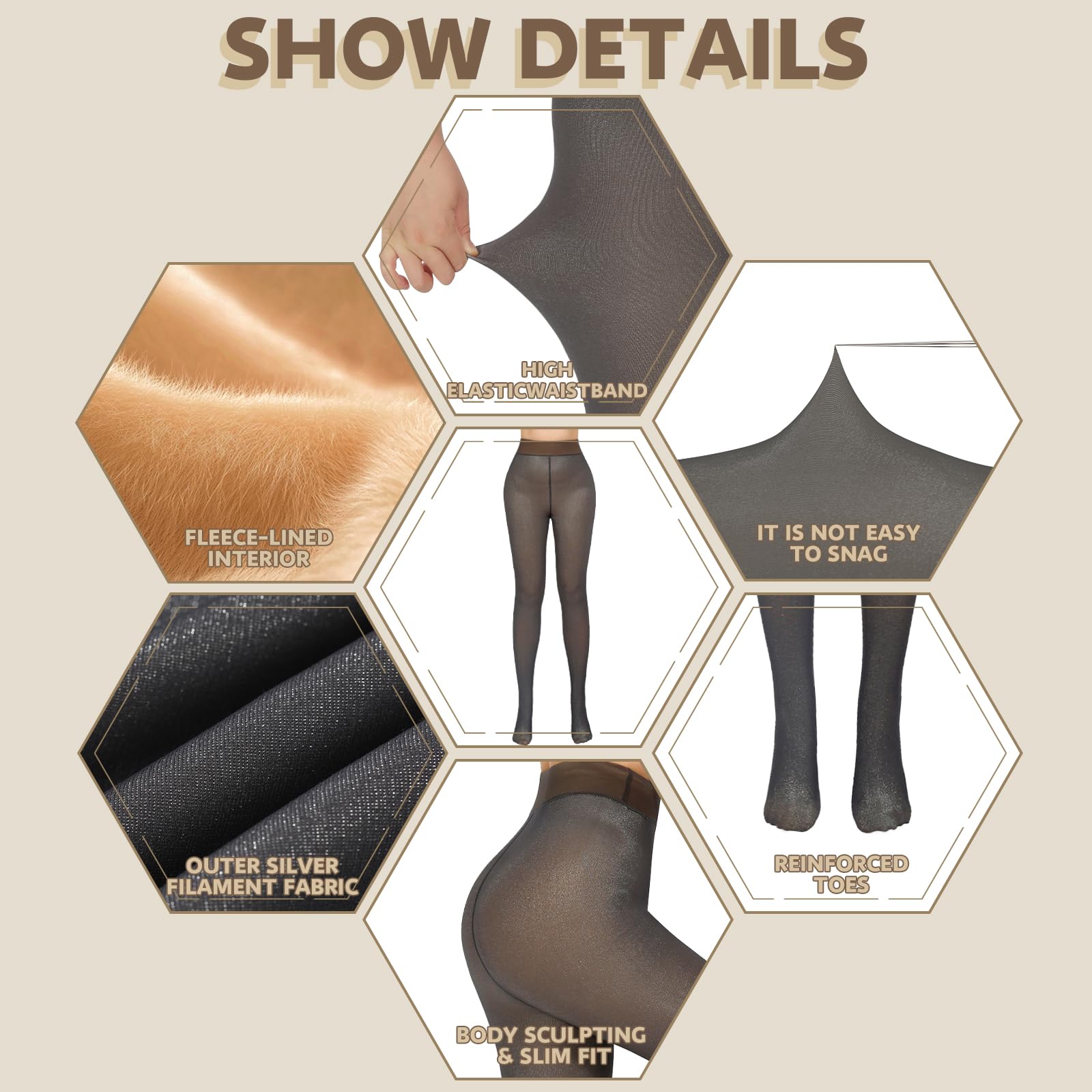 【220g Thinckness】220g (thick fleece lined) thick tights keep you warm in cold weather (winter) without being bulky.The fleece pantyhose goes well with any outfits. The sleek look of thermal tights in classic colors (Black, Coffee, Grey) fits well with dresses, skirts, boots, high heels, etc. Wear a dress on a pretty cold day or comfortably wear them under your pants.