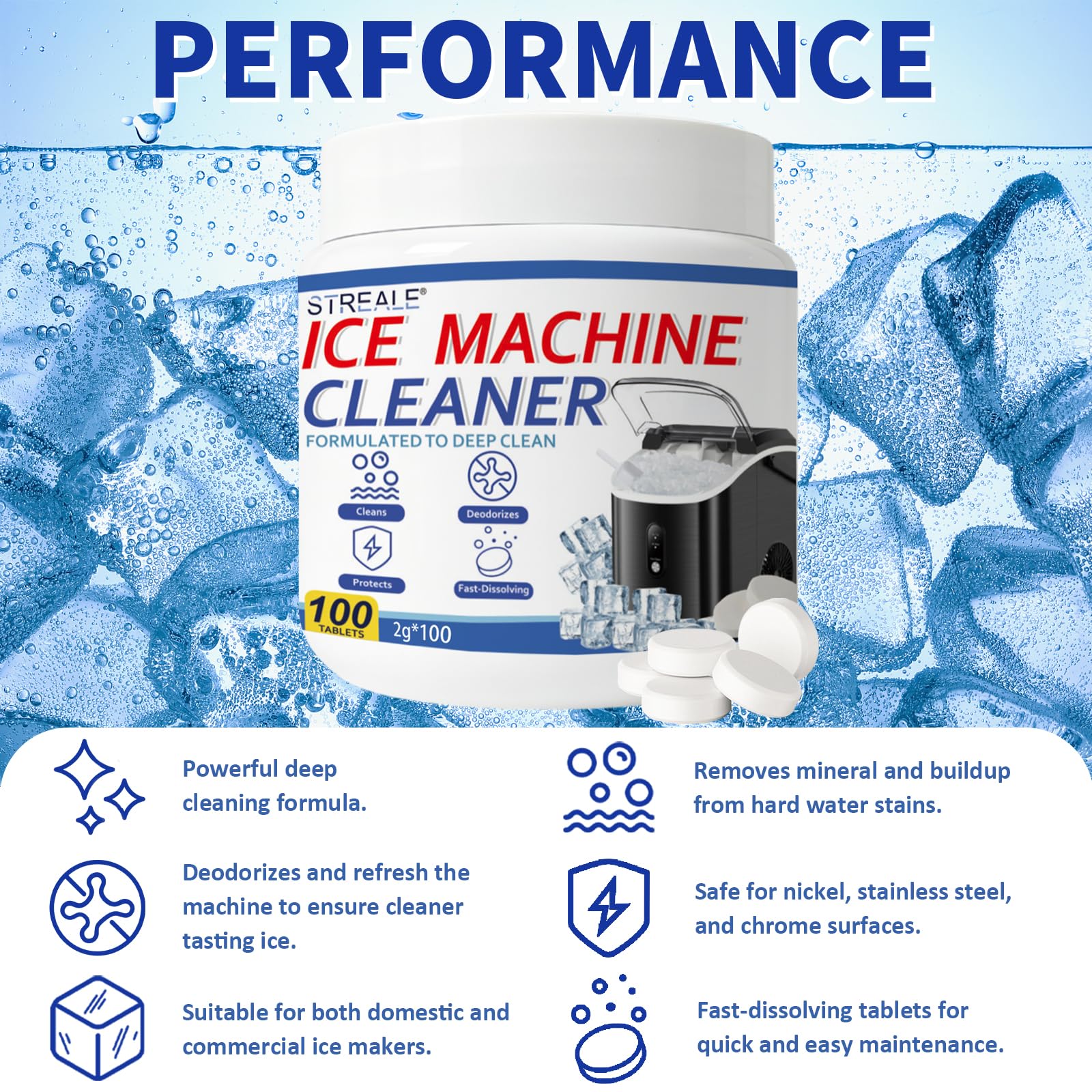 【Better-Tasting Ice】Designed for Countertop, Portable, and Commercial ice maker cleaner needs, our tablets ensure pure, clear ice with no off-flavors—perfect for drinks, commercial use, or home kitchens.