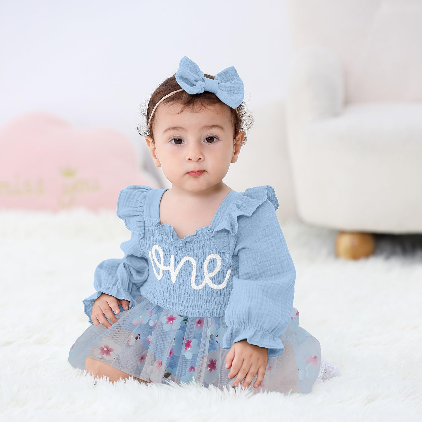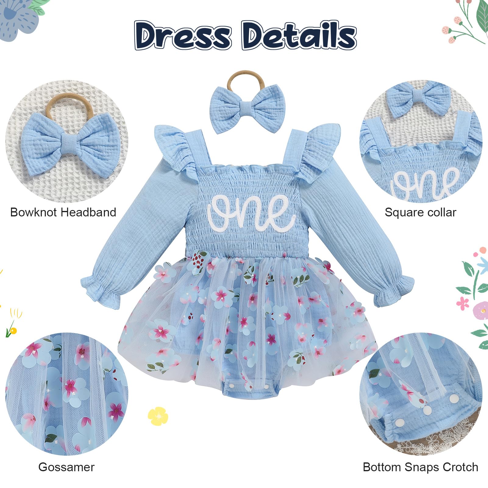 Design: Newborn baby girl playwear romper dress with long sleeve, solid color, multi-layered tulle, Snap leg openings for easy diaper changes, easier morning for novice mother.Cute princess 1st birthday outfit, fashionable and adorable embroidery ONE printed themed birthday clothes perfect for creating beautiful memory of her first birthday.